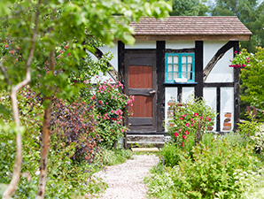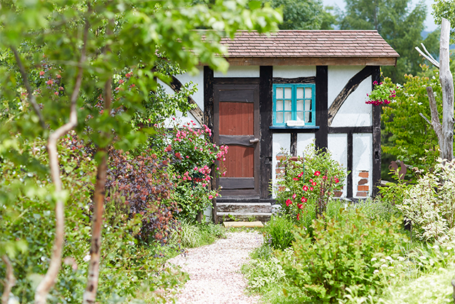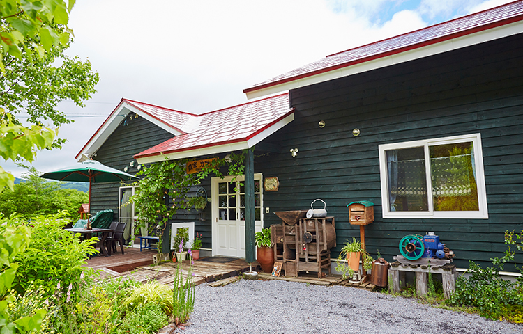 そこは役場などがある市街地から、オロフレ峠へ向かう道道2号線沿い。道路からまず見えてくるのは、赤い屋根が目を引く古民家風の一軒家だ。アプローチにはハーブやベリー、西洋野菜などが美しく配置されたガーデンがあり、奥には、童話に出てくるようなツリーハウスやガーデンハウスも見える。