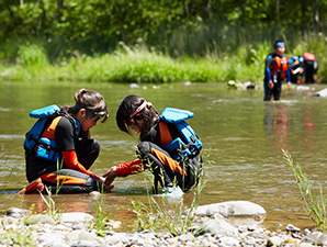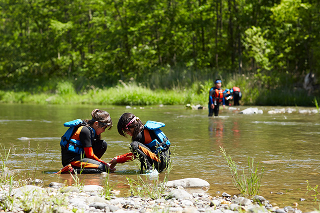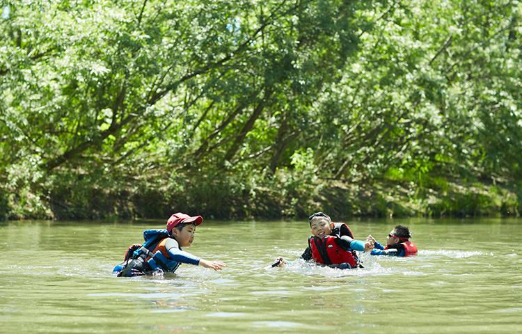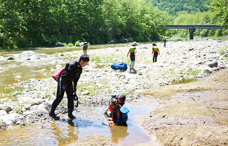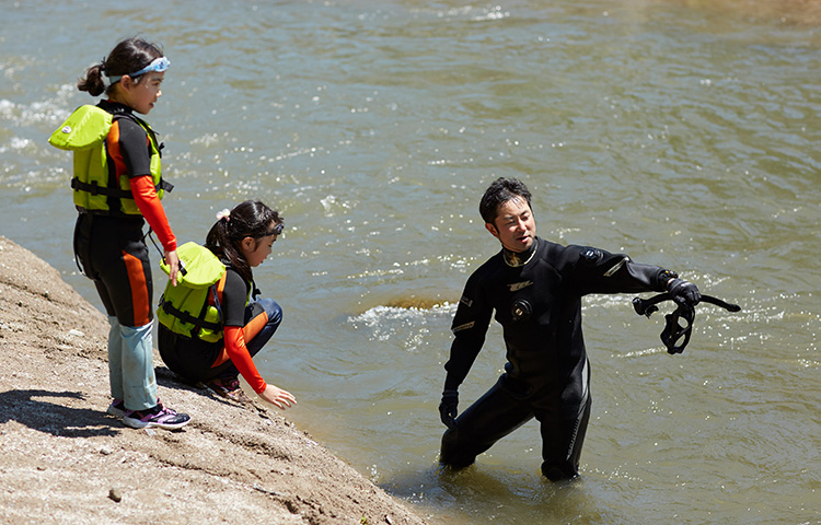 ウェットスーツにライフジャケット、ゴーグルというフル装備の子どもたちが川遊びをしている。いや正確にいえば、川に潜って魚類や水生昆虫を観察しているのだ。すると、両手で小さなウグイをすくい上げ、私たちに見せてくれる子がいた。