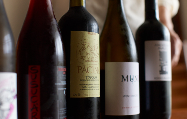 「このワインは、イタリア自然派ワインの第一人者、アンジョリーノ マウレさんという造り手の『ラ・ビアンカーラ』。ここで修行したダニエーレ・ピッチニンさんという人が造った『ムーニ』は、ほどよく個性が感じられるバランスのとれたワインで、おいしいのにリーズナブルなんです!ラベルにシチリアのエトナ火山が描かれた『ススカール・ロッソ』は、梅干しのようなニュアンスのある味わいで・・・」。