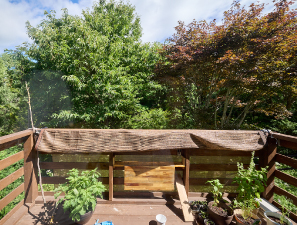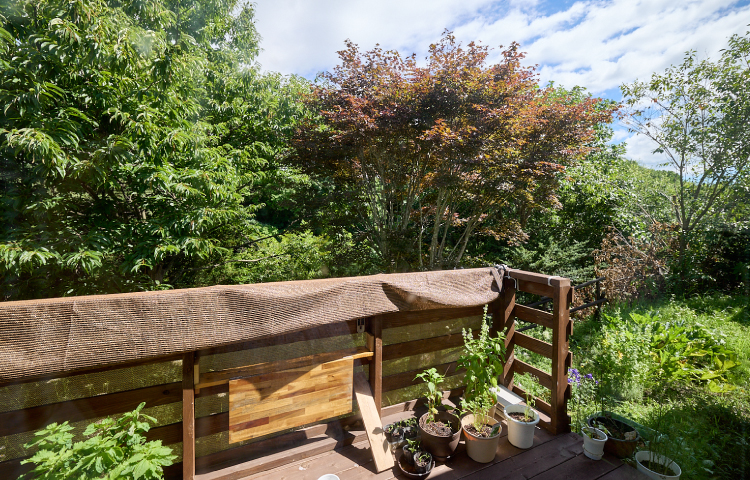 「移住先で家を探す時の条件は、近隣に住宅があまり無いこと、楽器の音を出せること、海や山が見えること、でした。壮瞥町に海はありませんが、このバルコニーの先には町民が守り続けてきたという清流の壮瞥川が流れ、緑の借景を楽しみながら音も出せます。車で少し走れば洞爺湖が、歩けば昭和新山を間近に見る。そして、一戸建てとしては珍しい賃貸だったことも決め手の一つでした」。