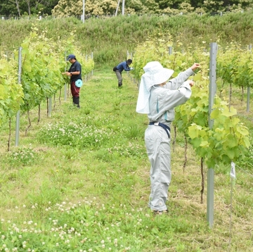 伸びた枝をワイヤーに固定し、伸長に使われる養分を抑え果粒の肥大を促すため枝先を摘まんでいく作業です。