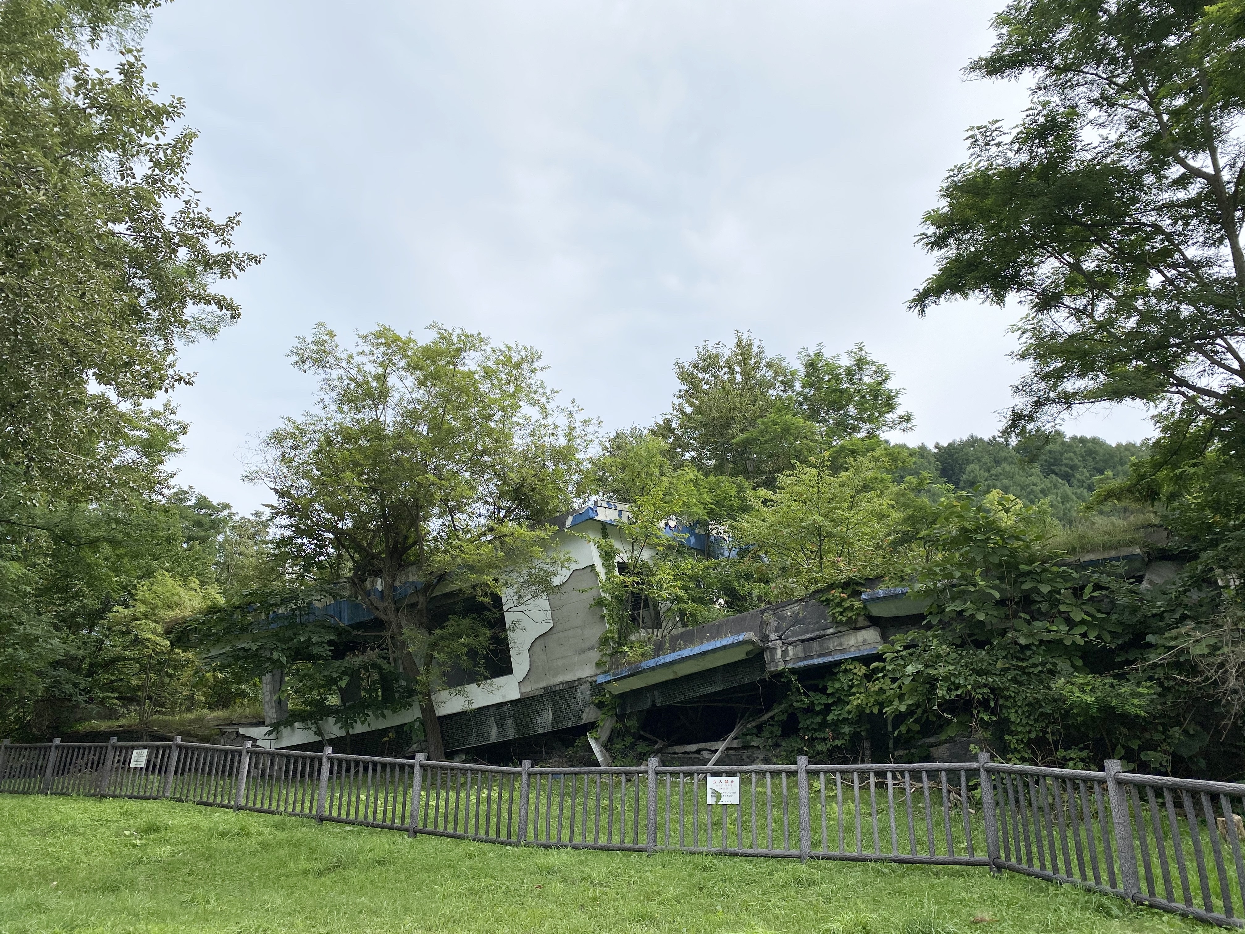 ここは火山災害を広く伝えていくため、倒壊した建物を保存、解説看板を設置して一般に公開されています。![]()
