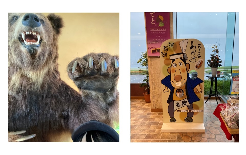 【わかさいも本舗】の顔パネルはかわいい店員さんに撮影をお願いしました。