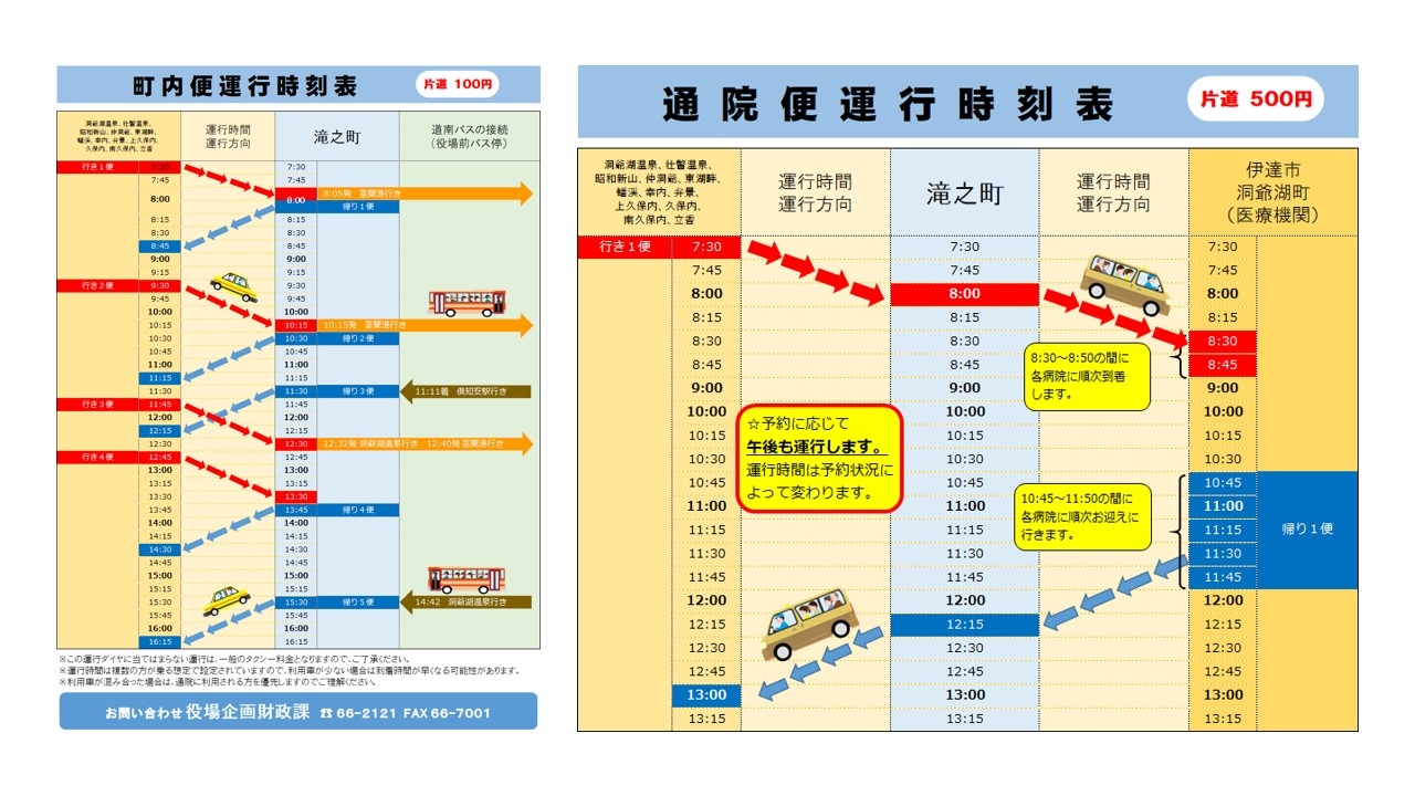 出発する役場は"滝之町"にあるので、青い枠の【10:30 帰り2便】で向かい、