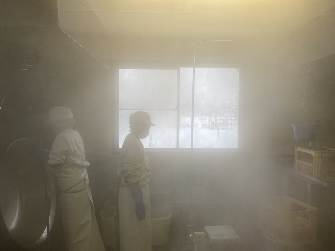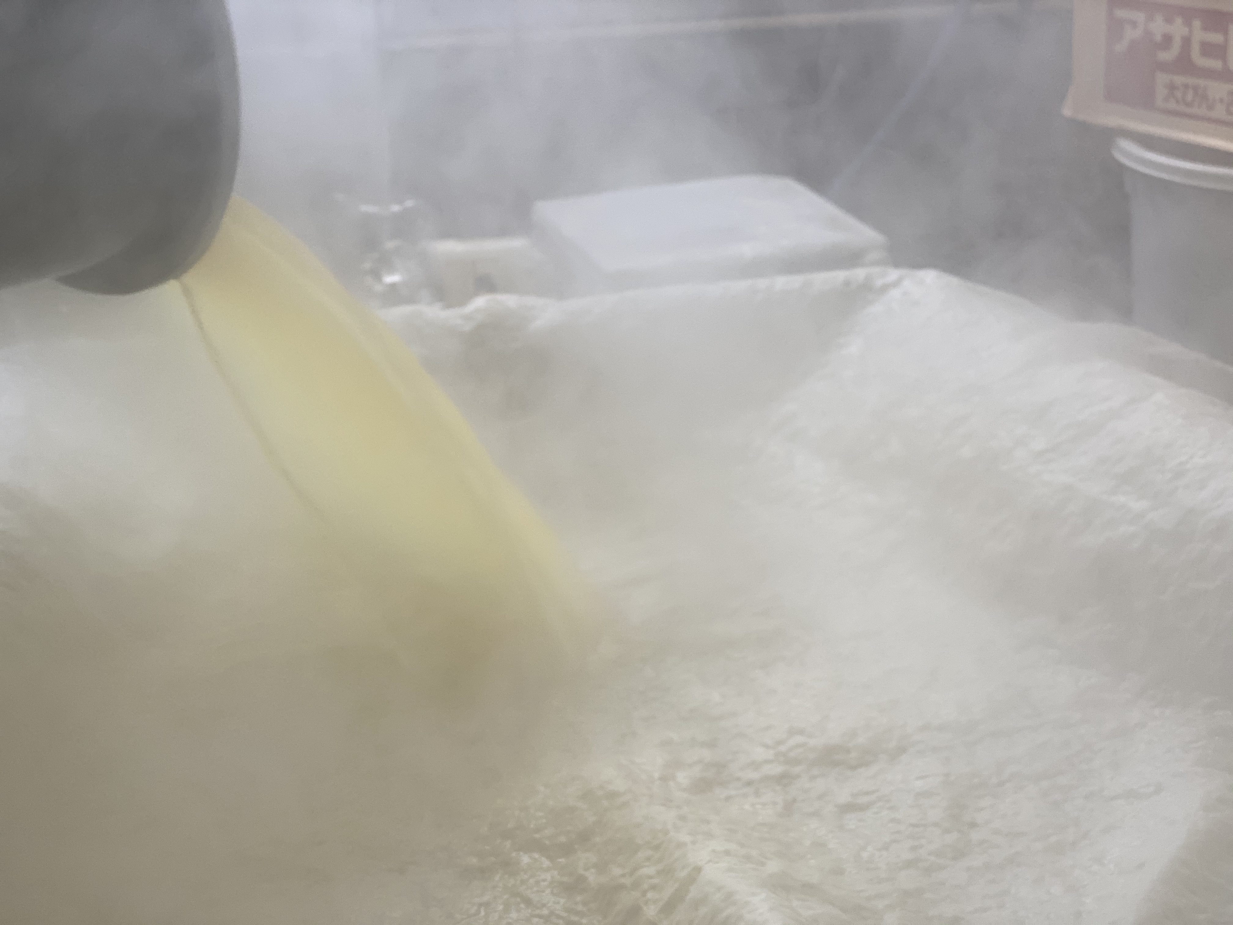 大きな炊釜から次の工程に進むために、別の容器に移動させているところなんです。![]()