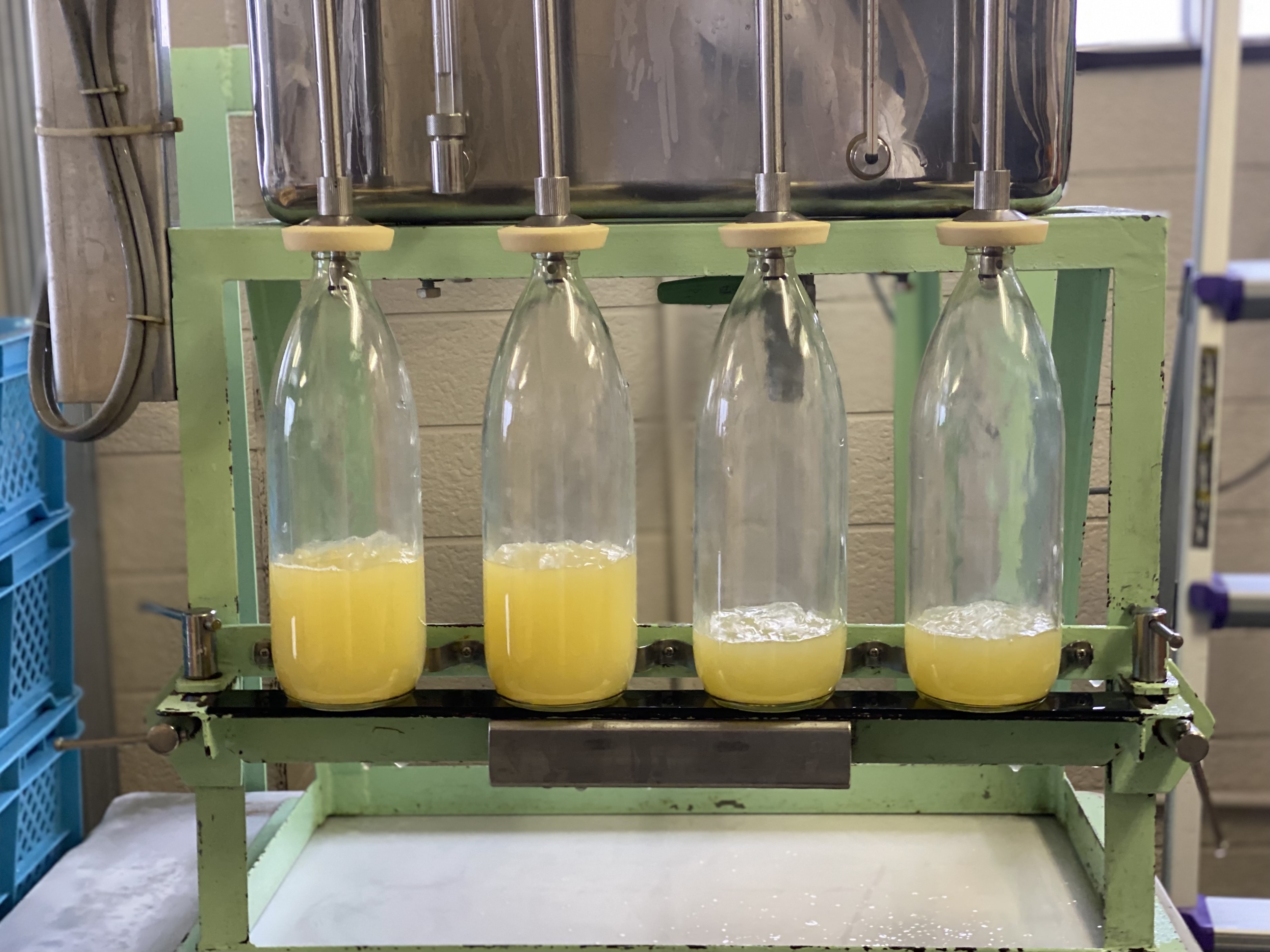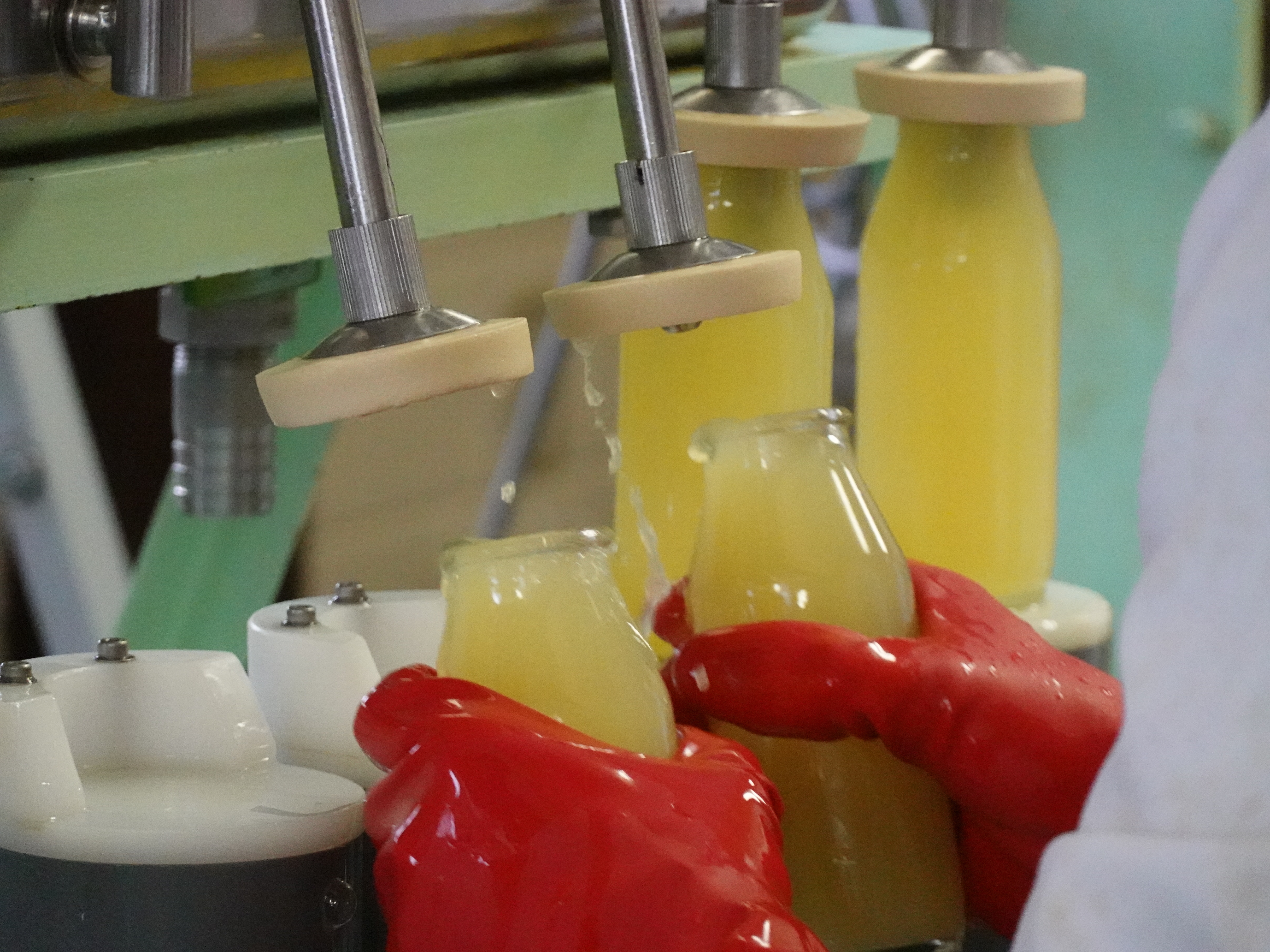 果汁の瓶詰めや栓の作業中、別の方は瓶の準備もしていました。