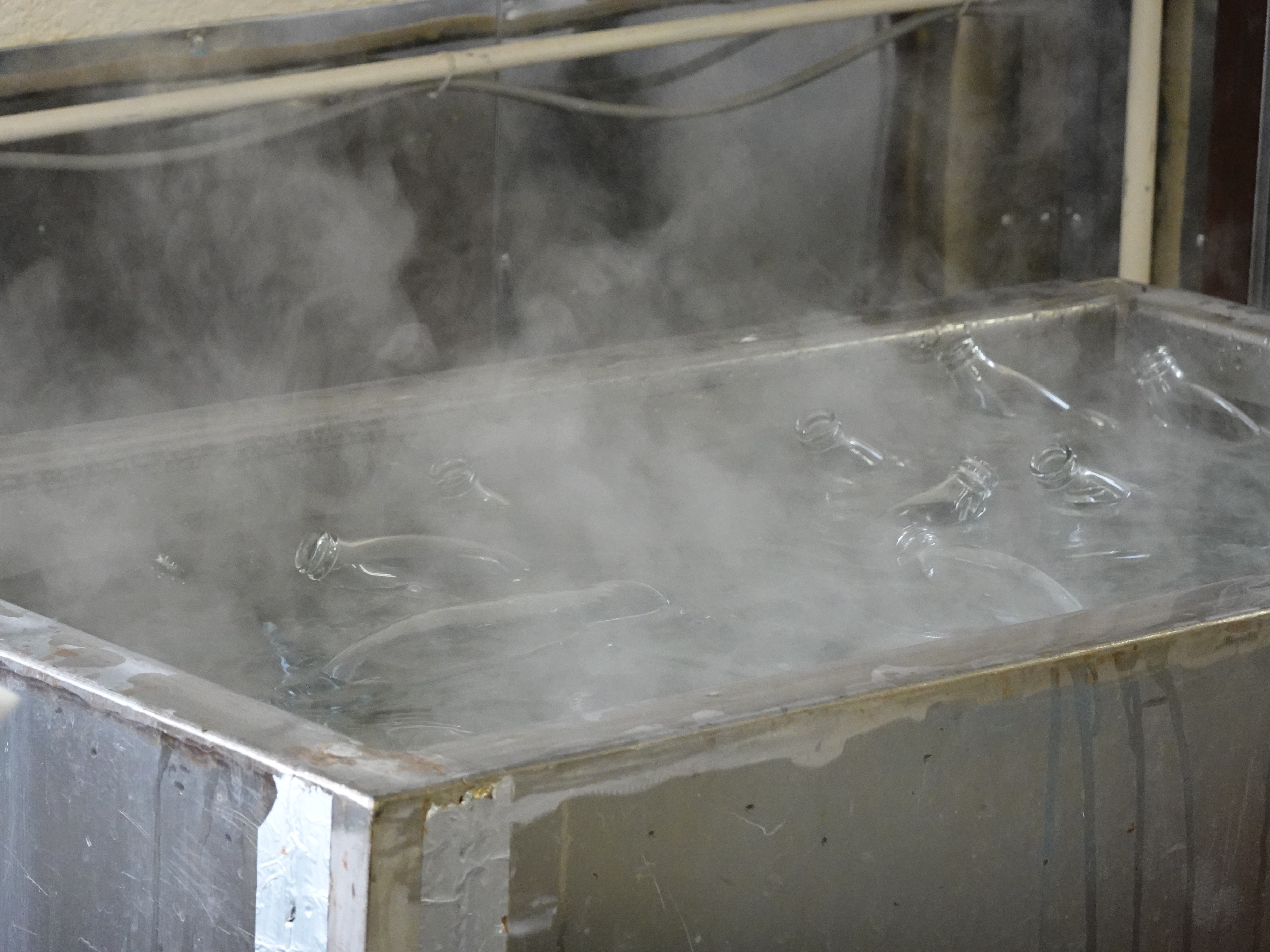 瓶の割れや汚れがないかチェックした後に、熱湯で殺菌していました。