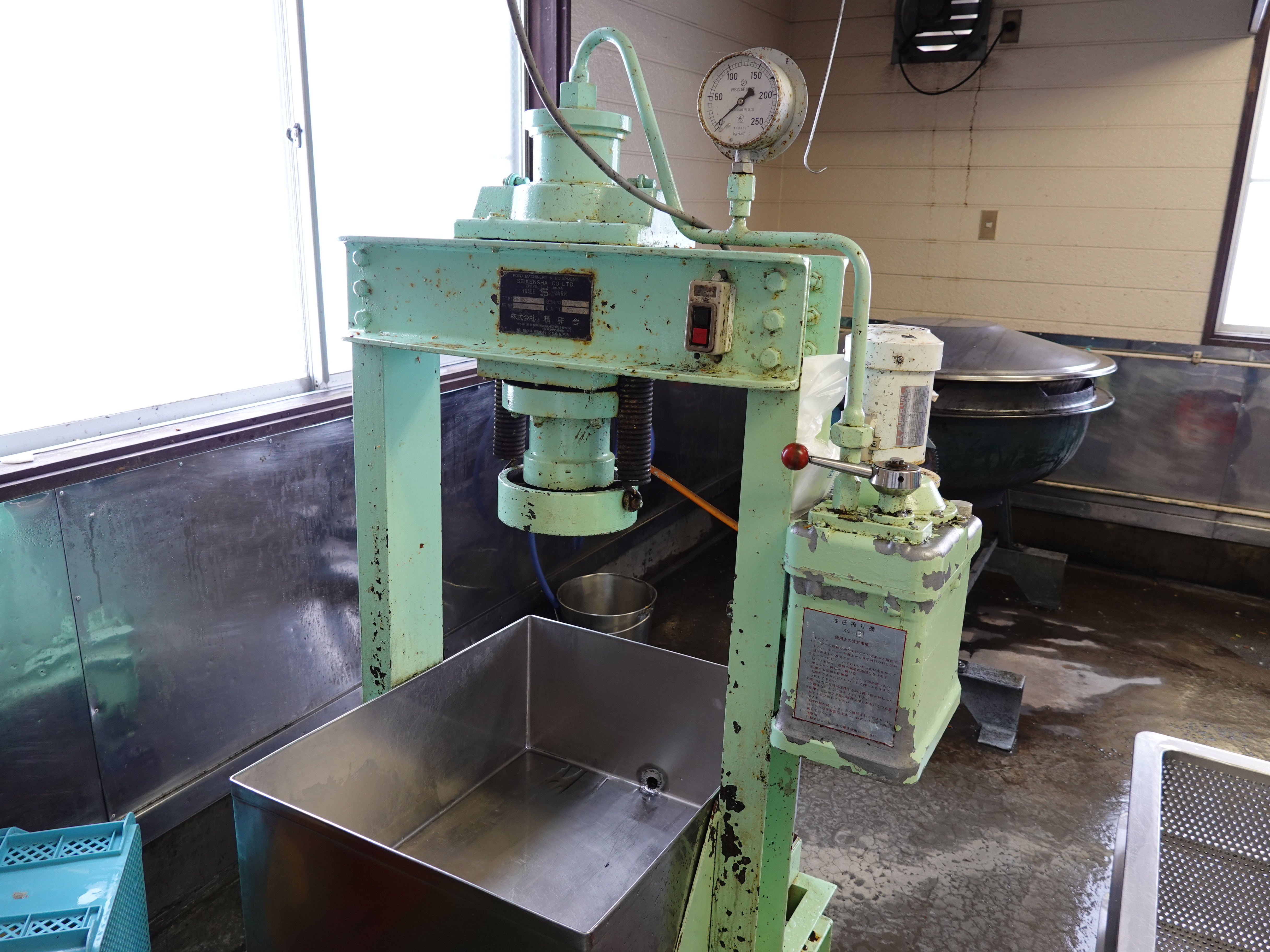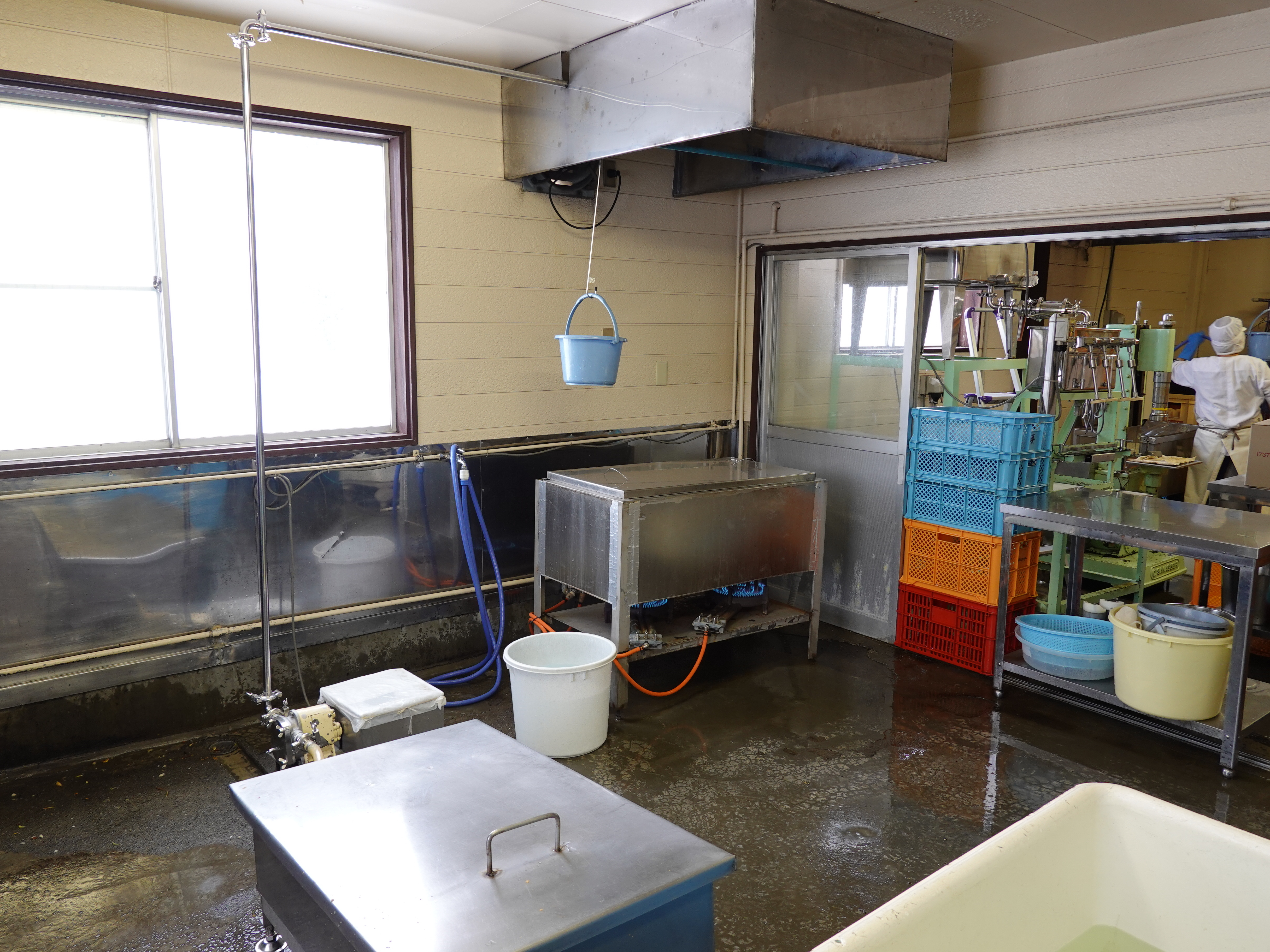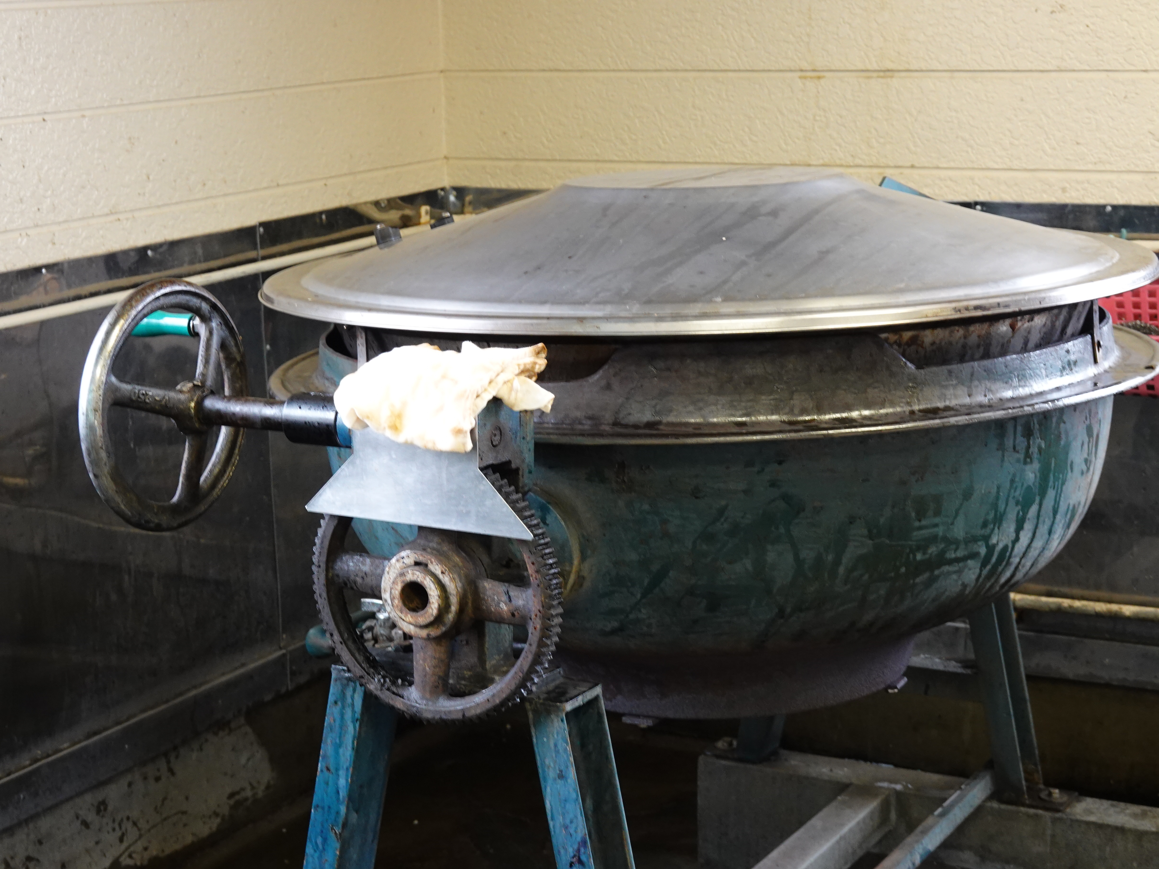写真の左側では、果汁を移動させた後の大きな釜を早速洗っています。