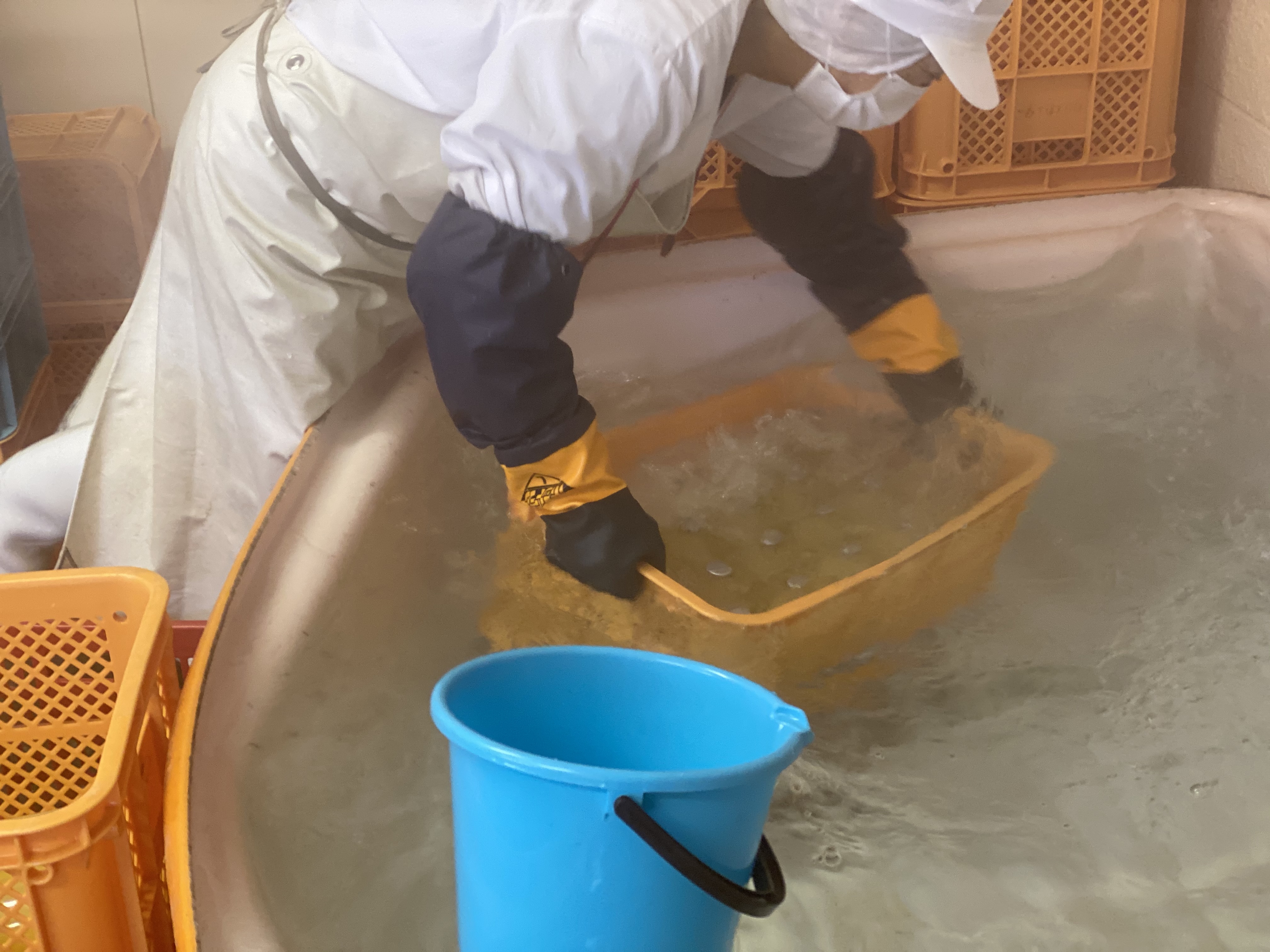 このかごを女性1人で持ち上げて、冷却用の大きな容器に入れていきます。