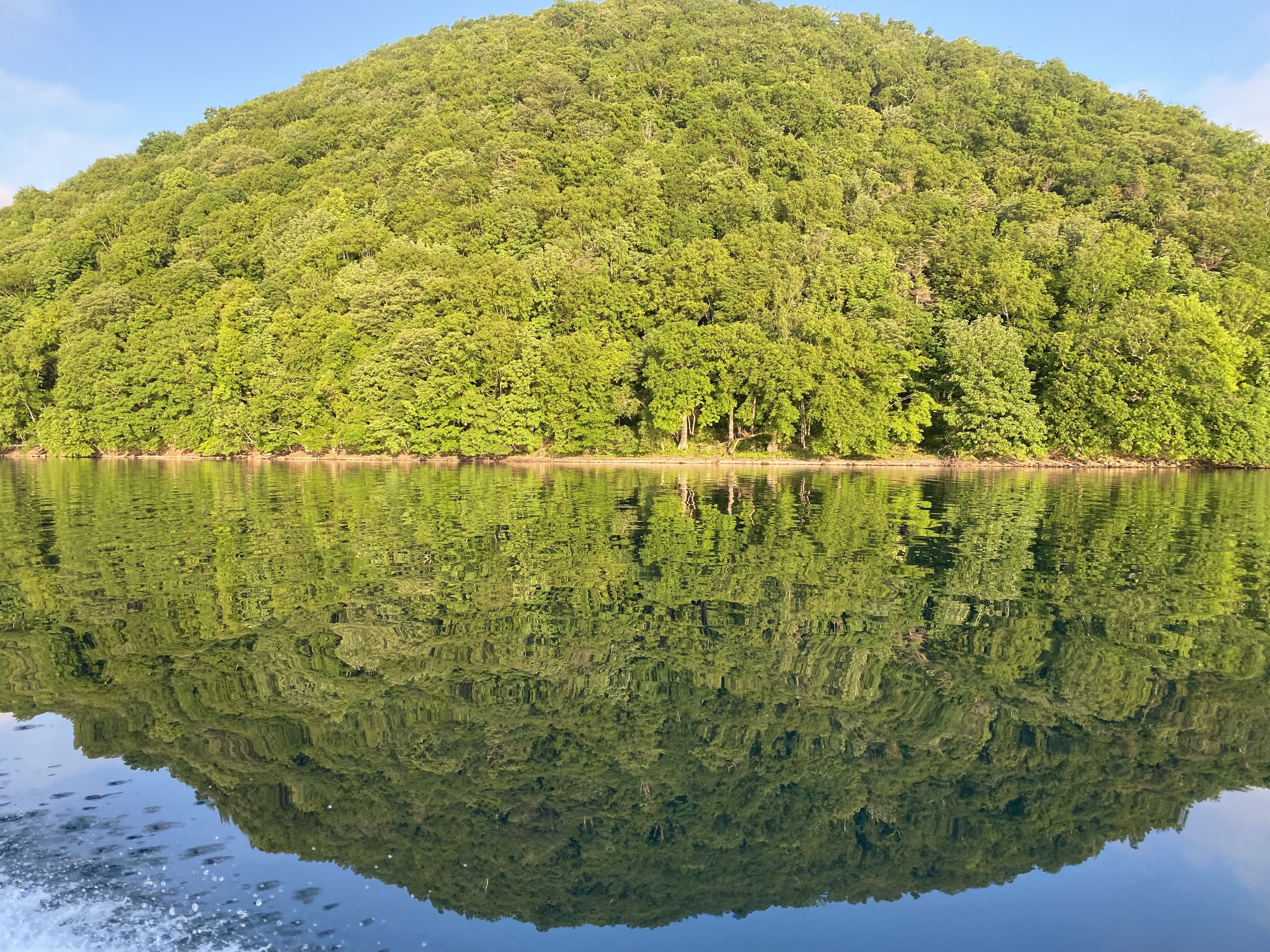 近づくにつれて霧も晴れ、水面が鏡のようになり