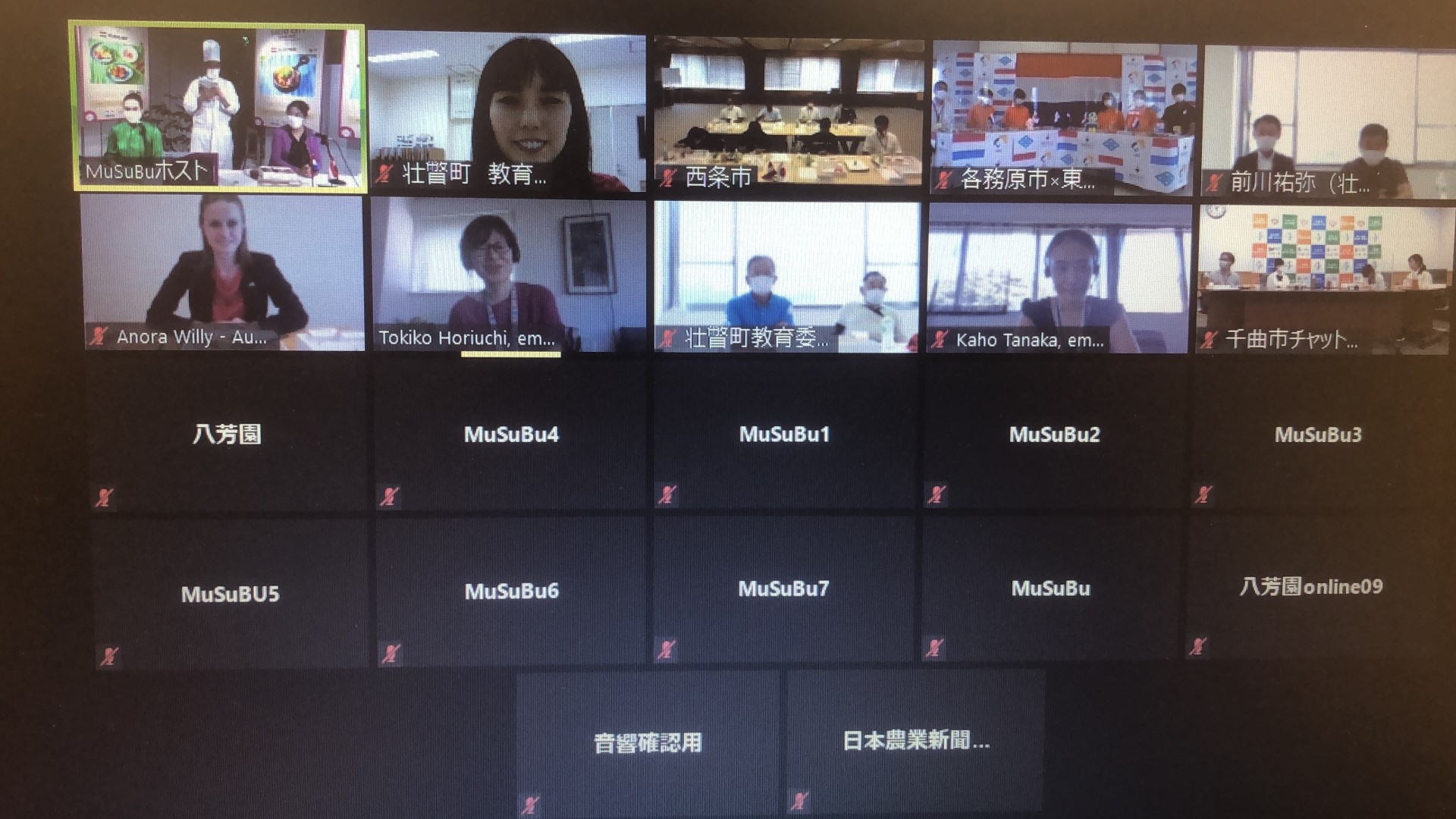 この交流会では、各地の参加者が作製したおもてなし料理レシピを元に株式会社八芳園のシェフが調理した料理を各地に郵送し、それを画面越しに一緒に食べるというものでした。