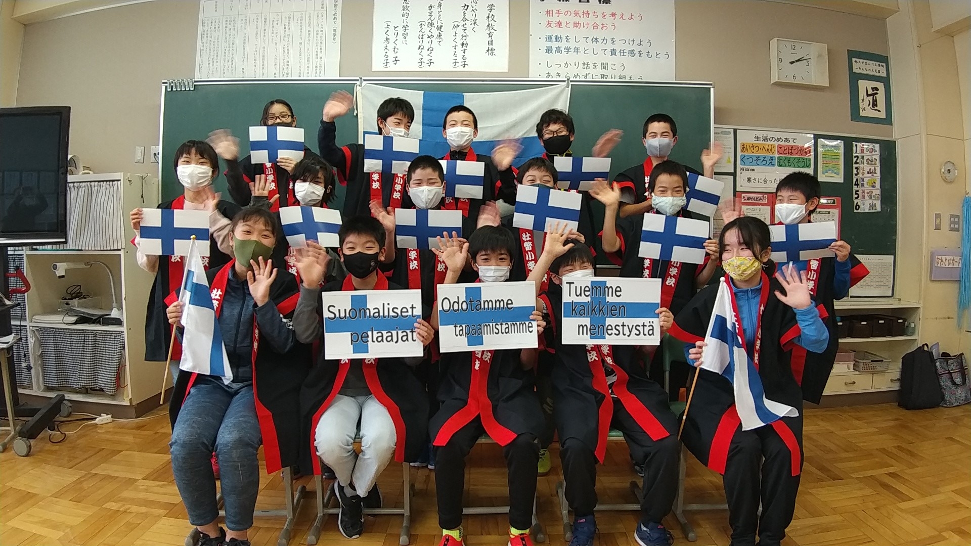 まず教育委員会の担当者がZOOMを使い、オンラインでフィンランド国旗や国歌について勉強しました。