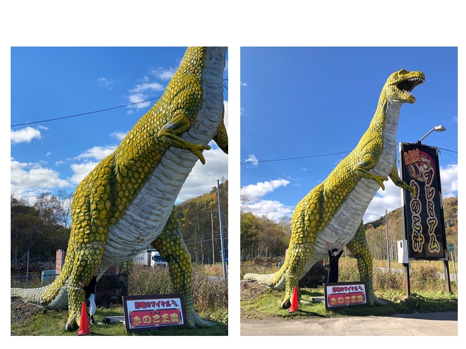 『きのこ王国』のアイドル、恐竜のマイケルと記念写真