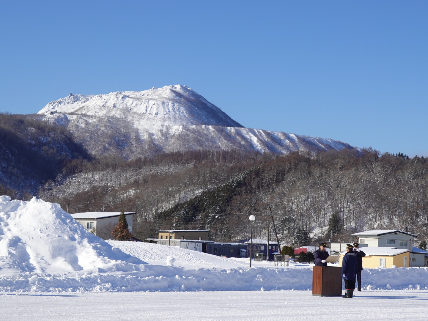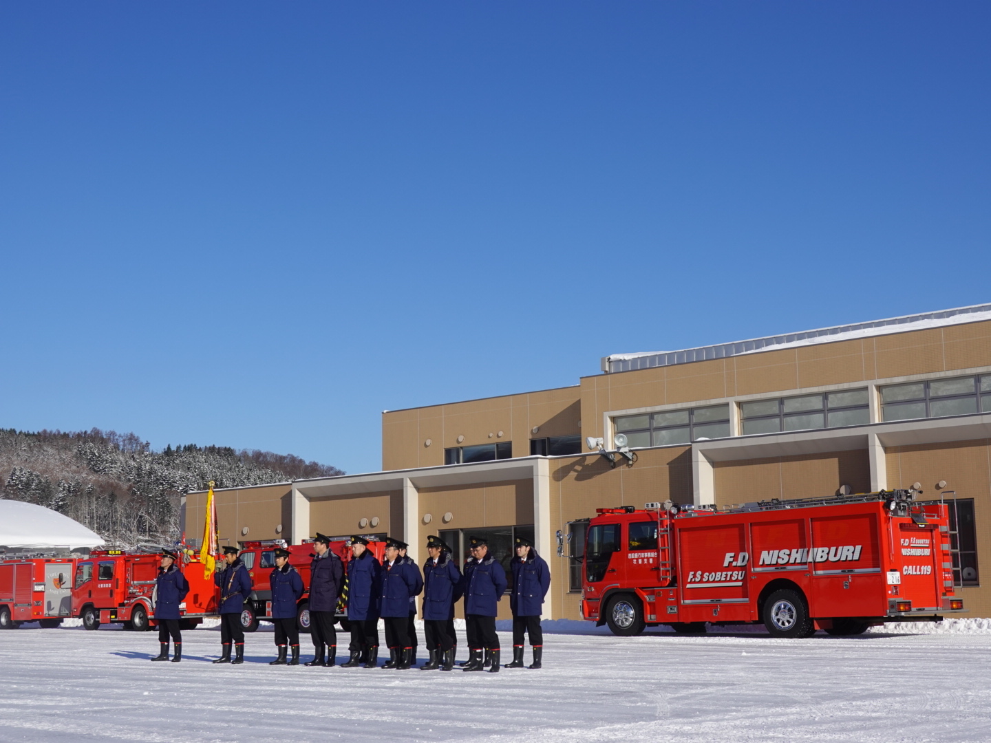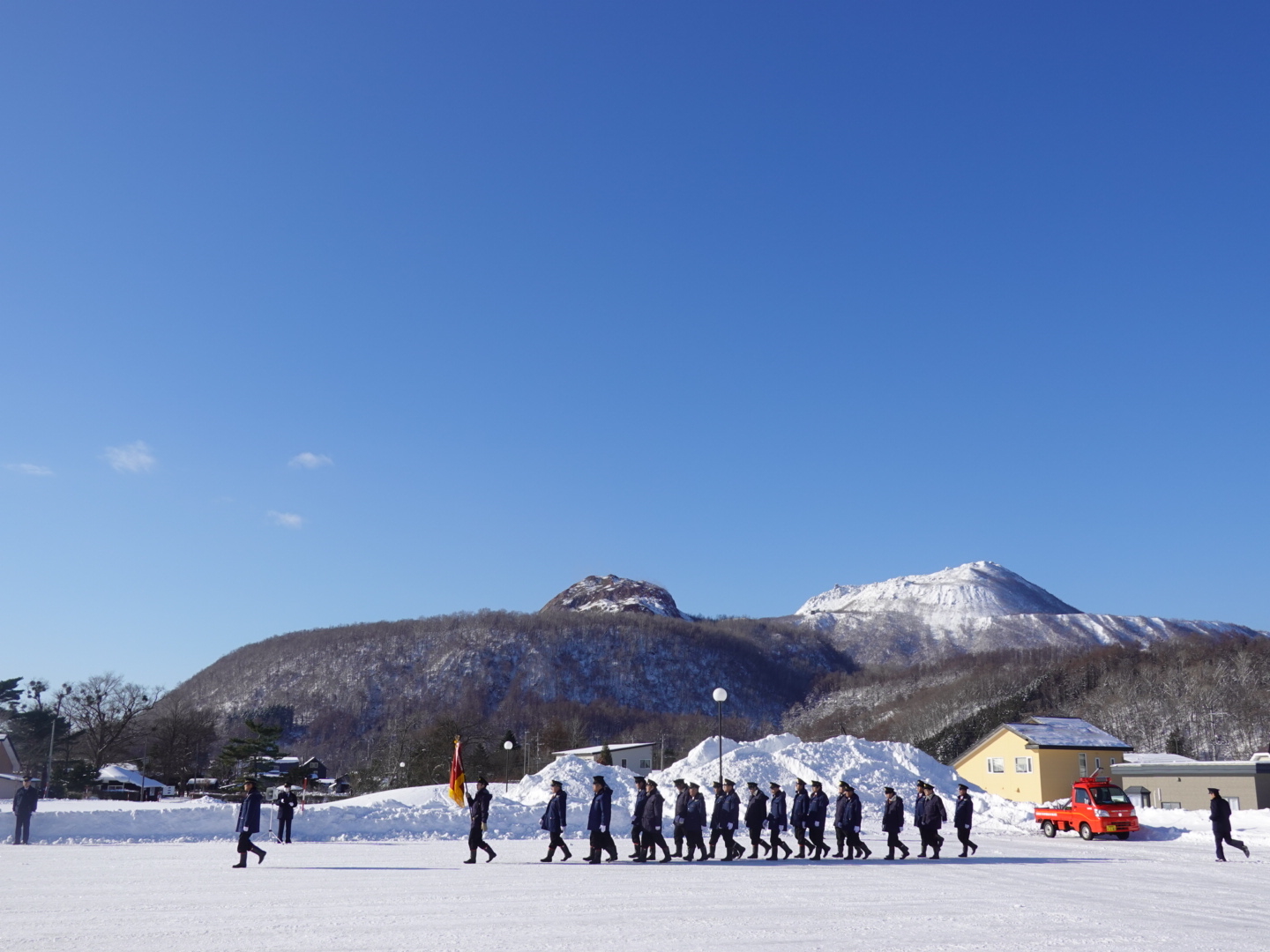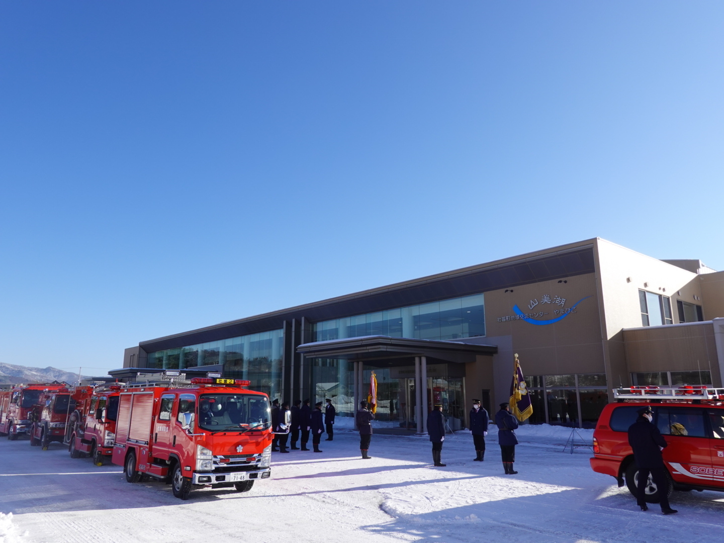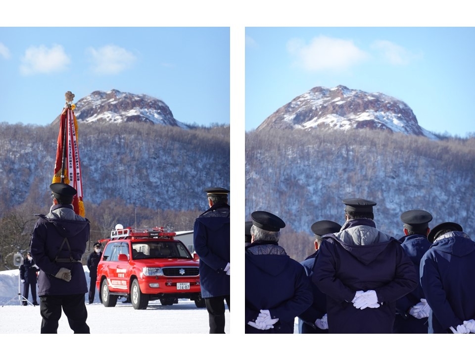 地域交流センター山美湖の駐車場で壮瞥消防団の出初式が行われたので