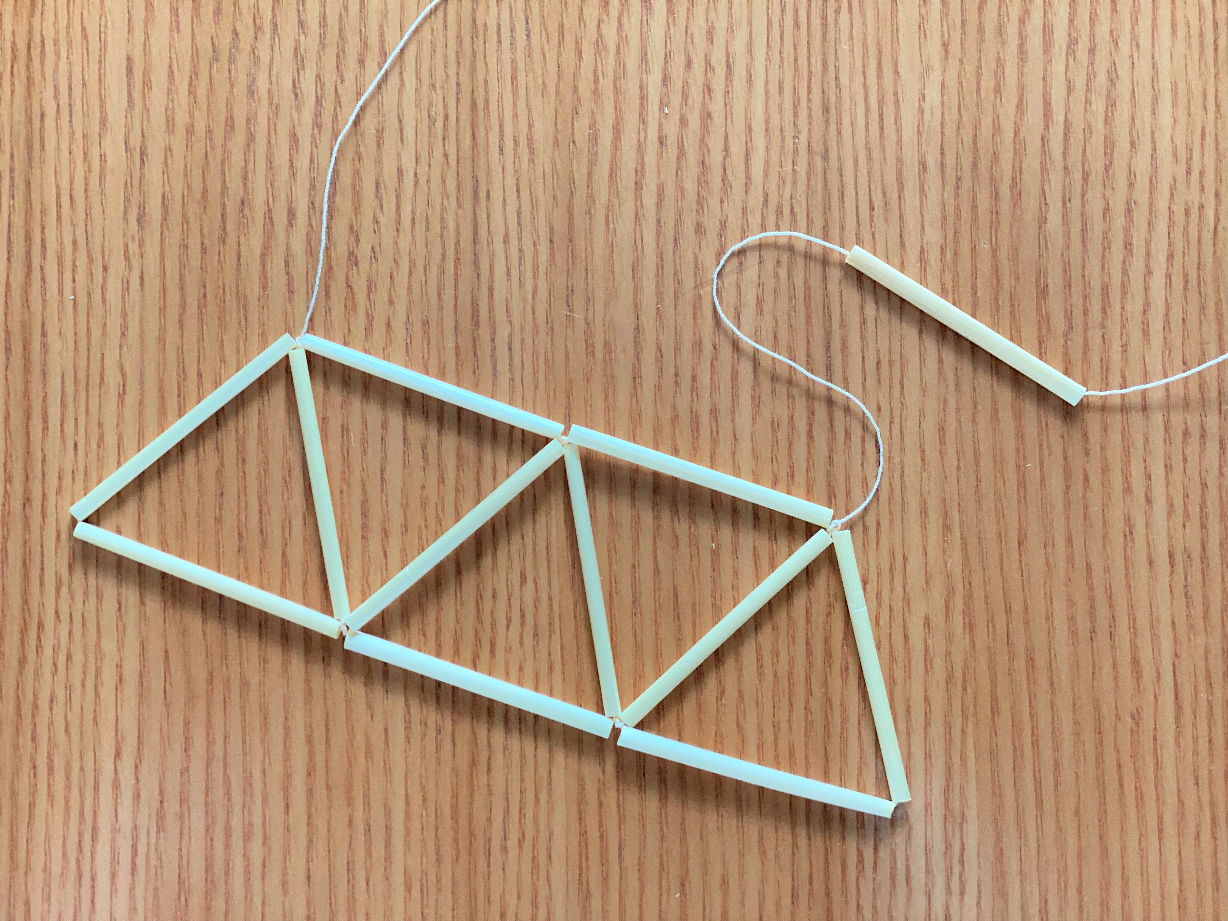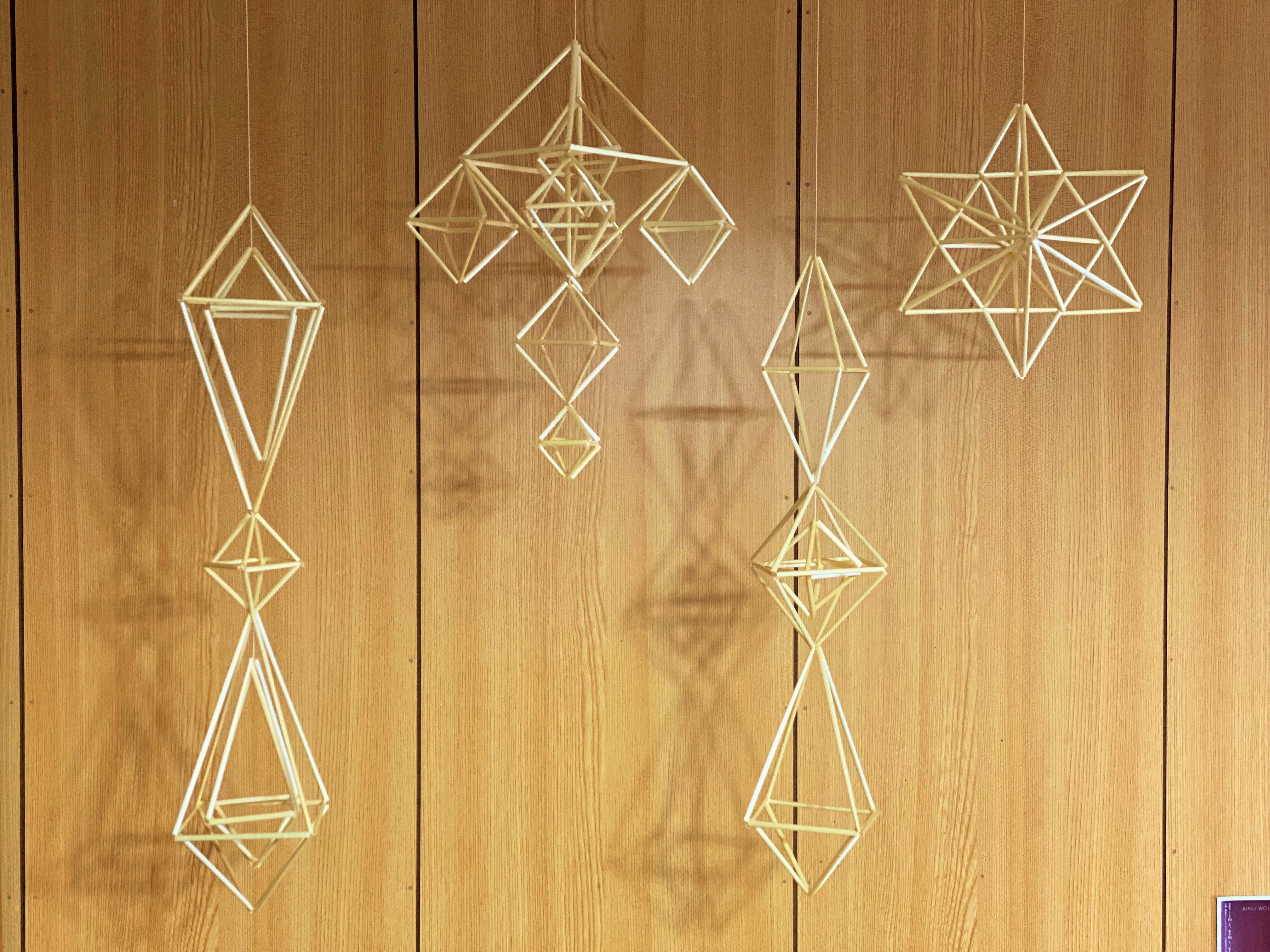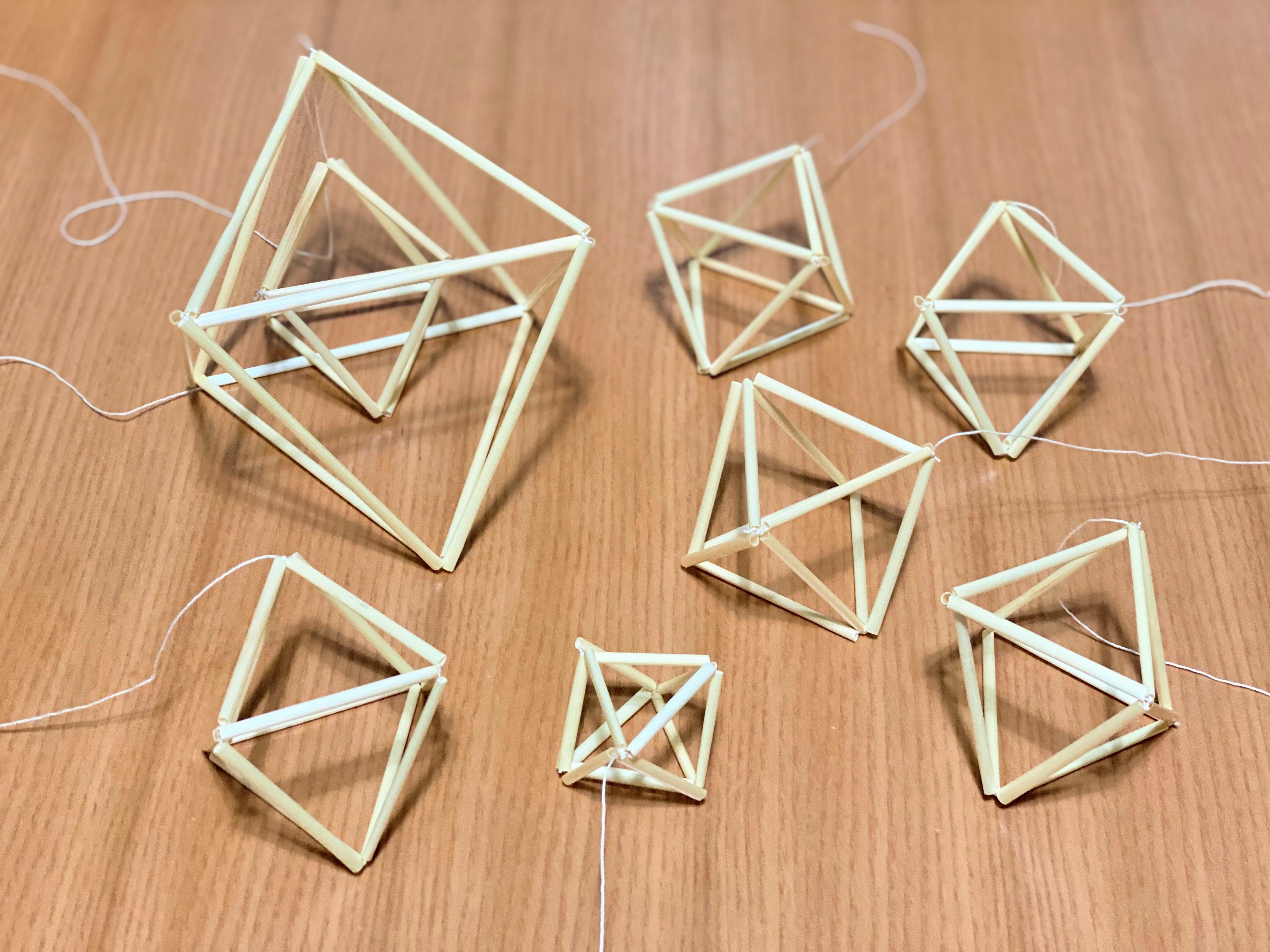 麦わらで三角を作って糸で繋げて(結んで)いくと立体が出来上がり
