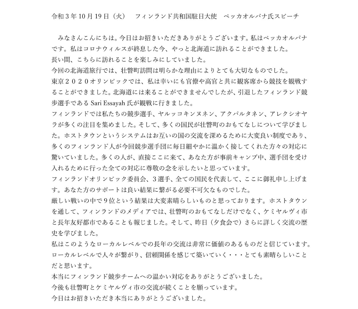 ご訪問時、ペッカ・オルパナ フィンランド駐日大使からただいたスピーチはこちらです。