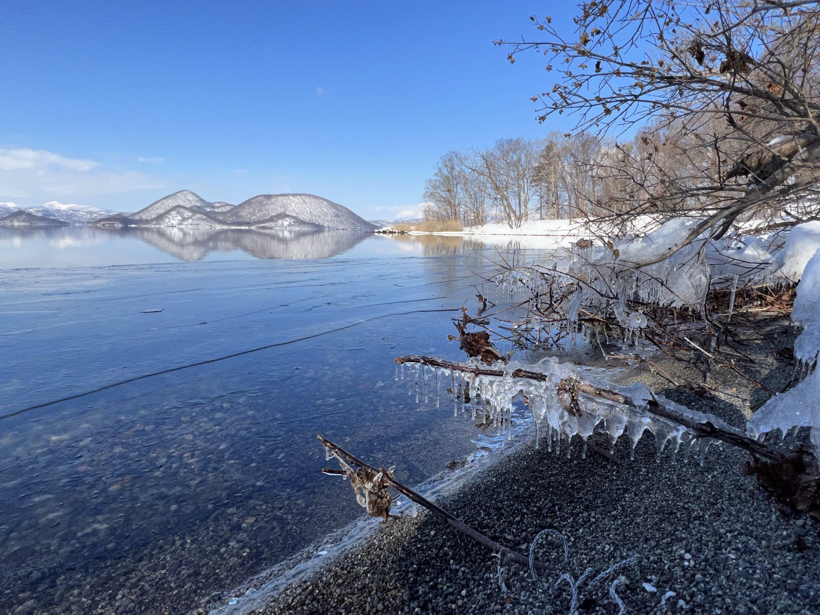 また、寒い日が続くと、不凍湖(冬に凍らない湖)である洞爺湖も、陸地に近い場所では、氷が張るところもあり、しぶき氷も見られます。