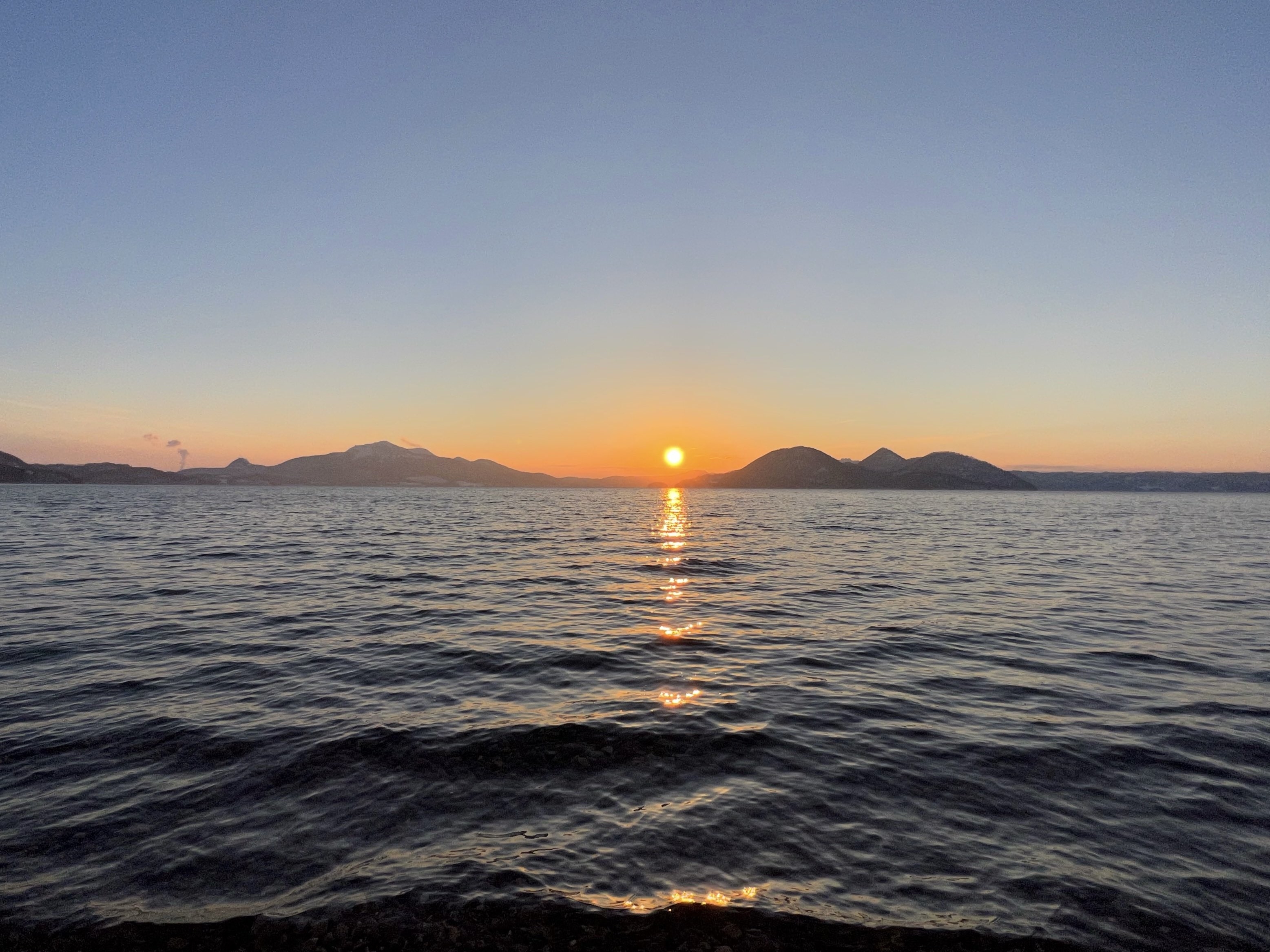 洞爺湖の西から中島方面を見ると、東から登る朝日が綺麗に、東から中島方面を見ると、西日が綺麗に見えます。