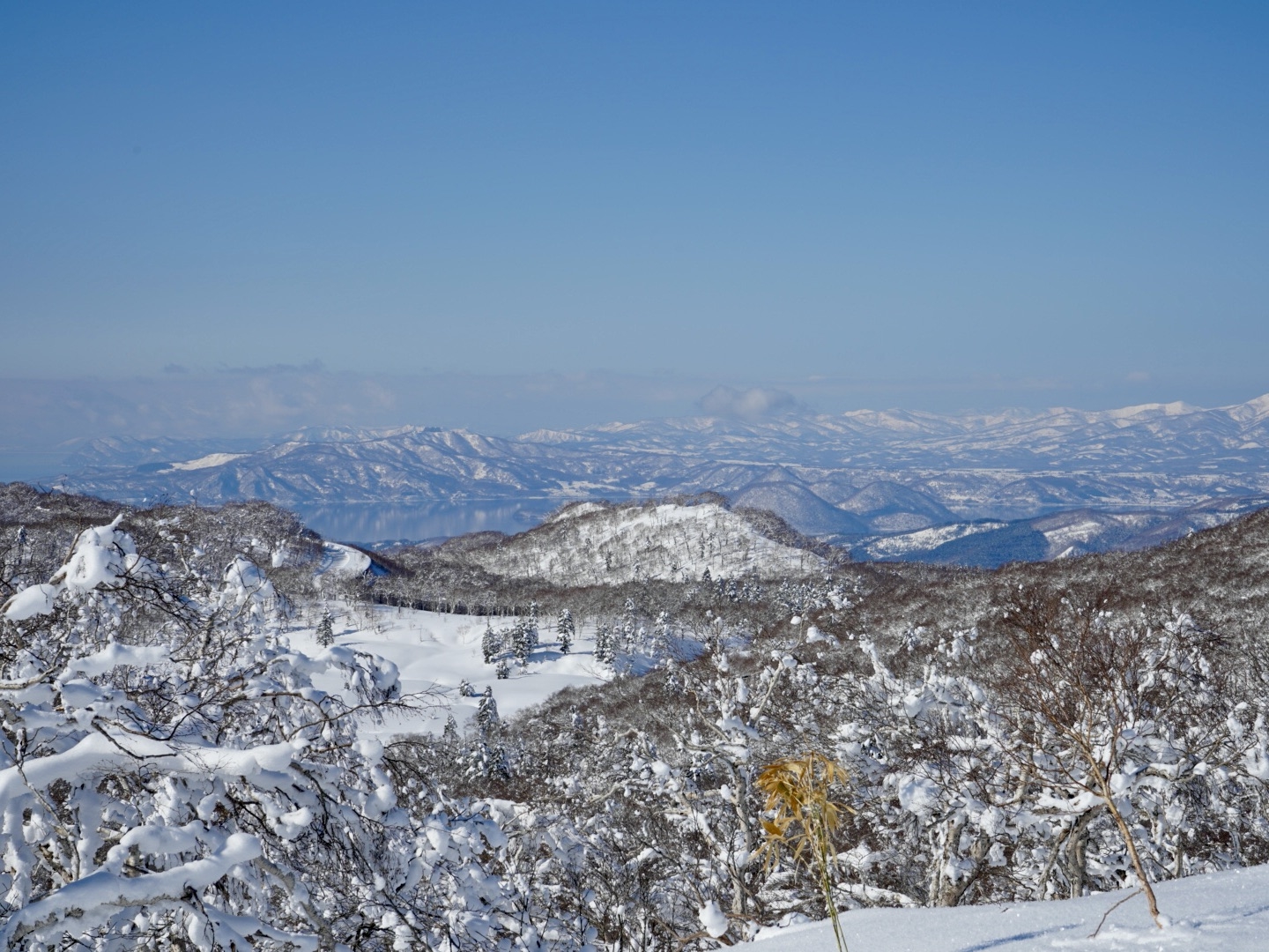 スノーシューを履いて、オロフレの小高い場所から眺めた景色ですが、中島が山々に溶け込むように見えて、美しい景色でした。