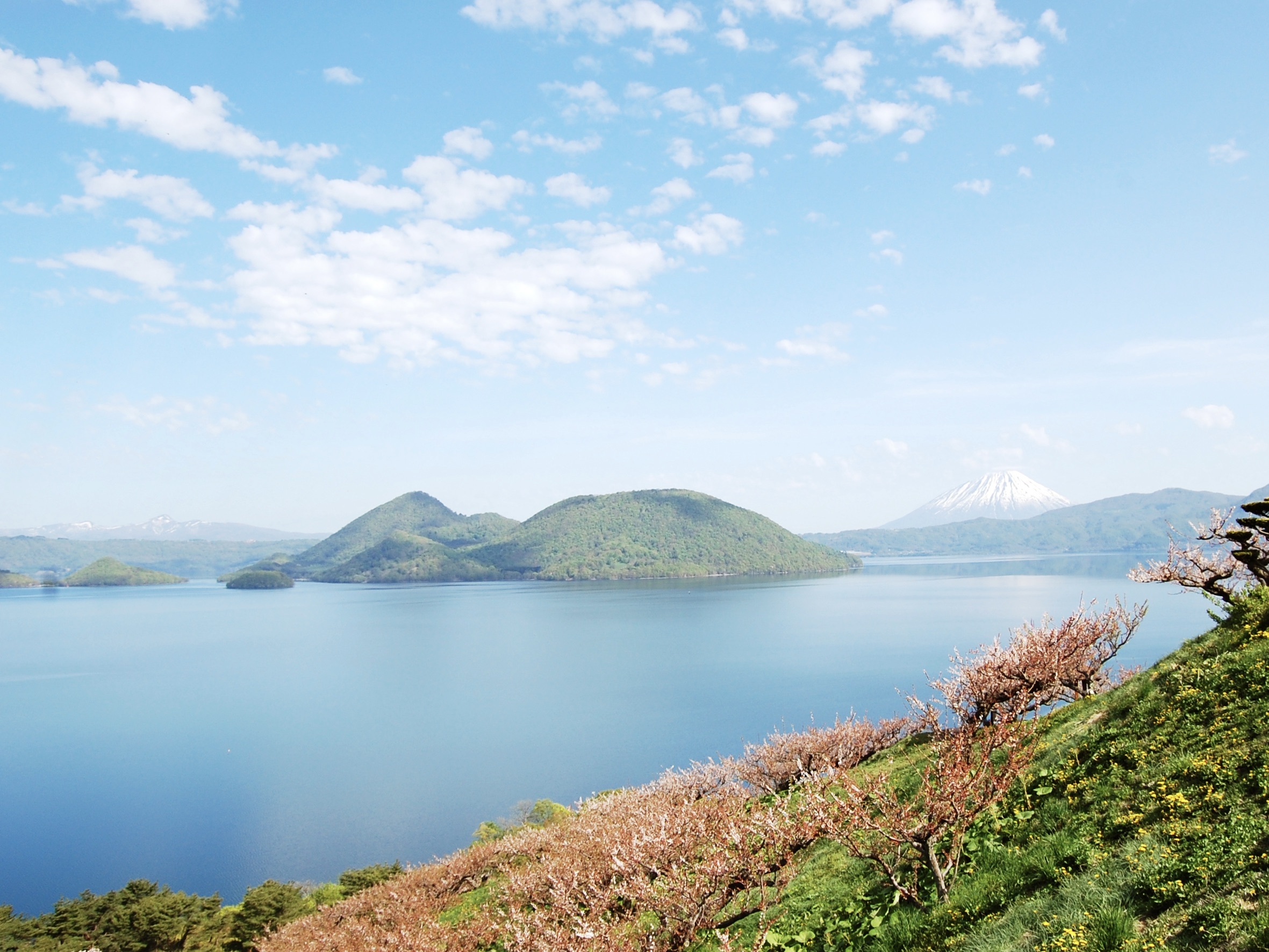 場所にもよりますが、湖畔からは有珠山、昭和新山や羊蹄山を中心とした山々を眺めることができ、中島を含めた洞爺湖そのものと、周りの山々との景色の共演が楽しめます。(写真は春の壮瞥公園)