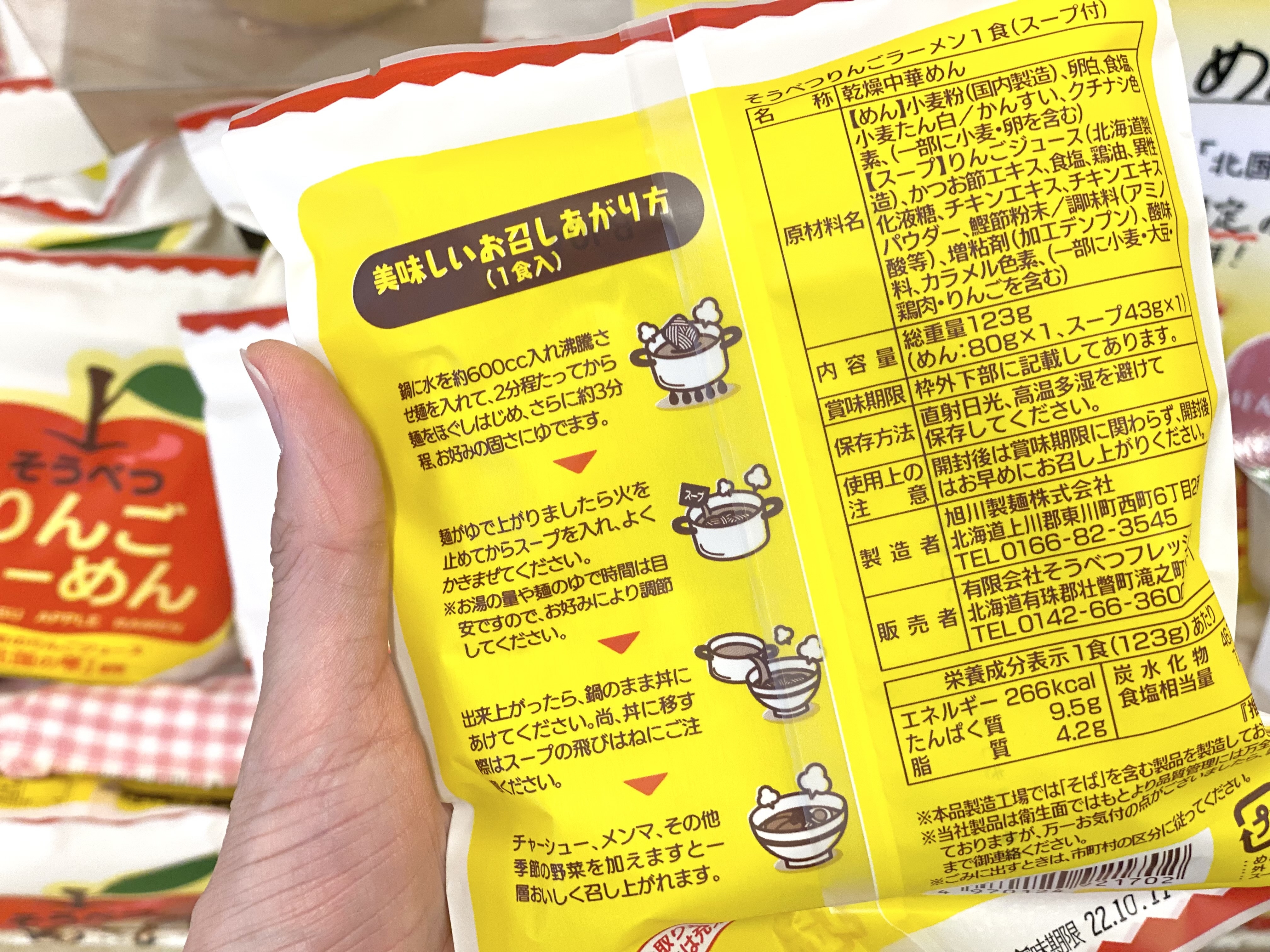 実はこちらの粉末スープに、壮瞥町のお土産で人気のりんごジュース「北国の雫」が使用されています!画像は少し文字が切れてしまっていますが、ベースになるのは塩味。麺は熟成乾燥麺。