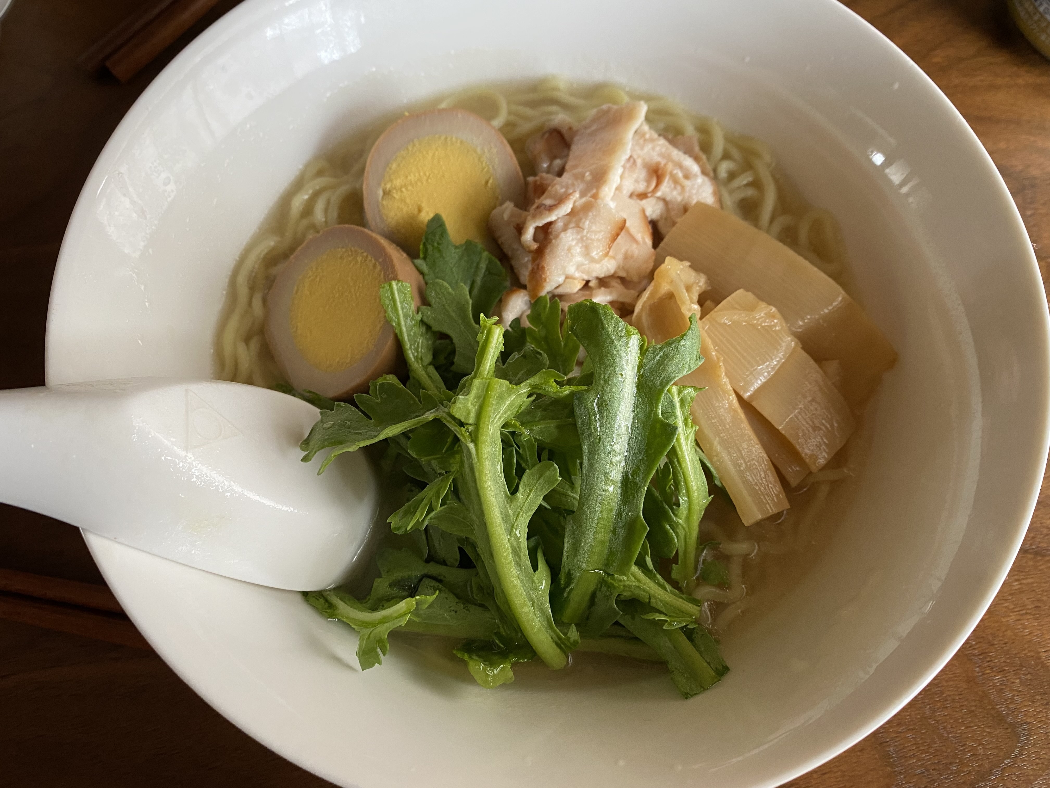 「セイコーマート」で購入した具材と「新藤ファーム」さんの春菊を乗せました。スモークサラダチキンと煮卵の旨味が増し、春菊がりんごの酸味を和らげ、鼻に抜ける香りも華やかに!今回はスモークサラダチキンでしたが、軽く焼いたチャーシューなら香ばしさがプラスされ、ラー油などで辛さを足して味変も楽しめます!