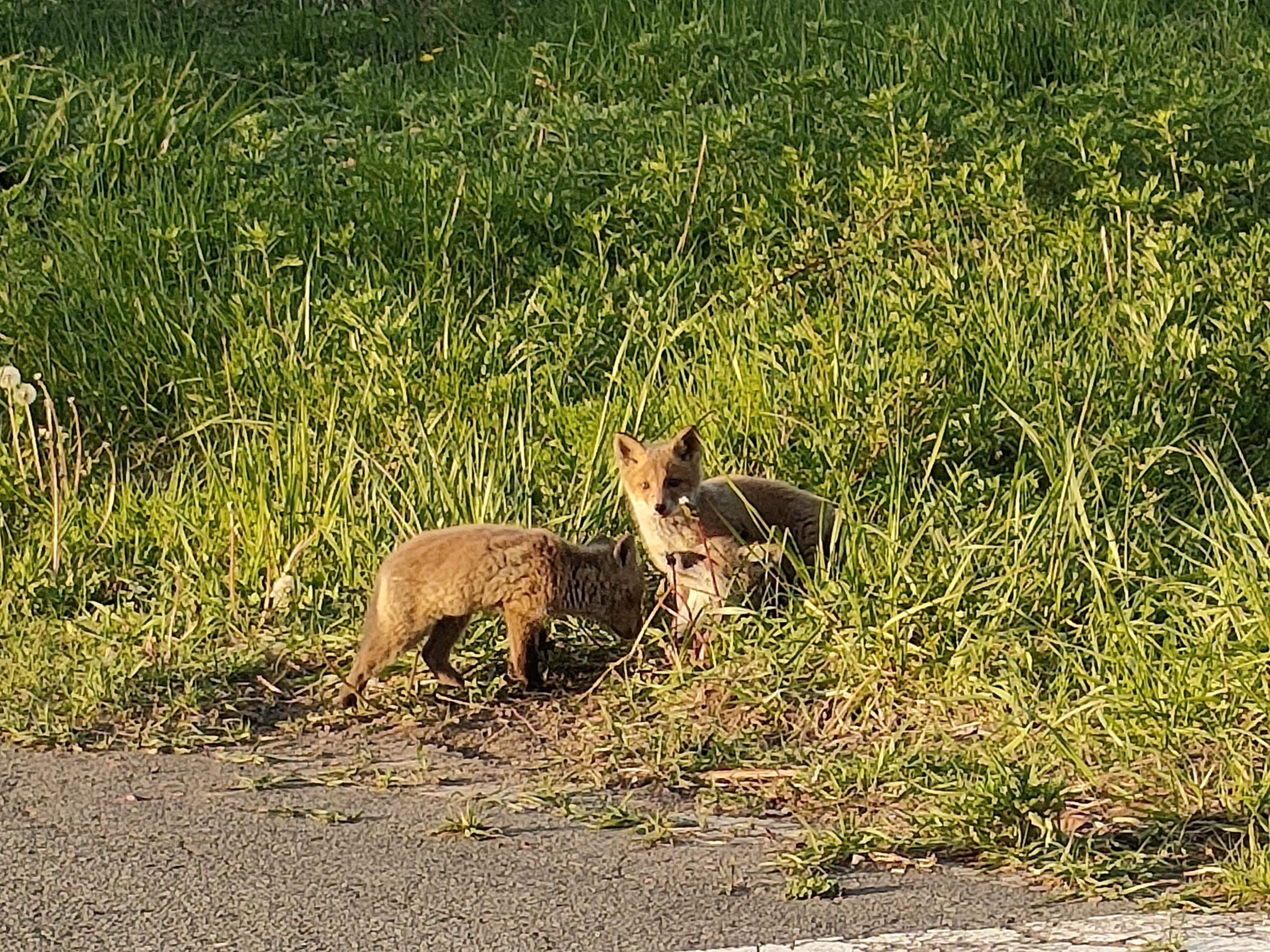 写真は、通勤路で遭遇したキタキツネの兄弟です。