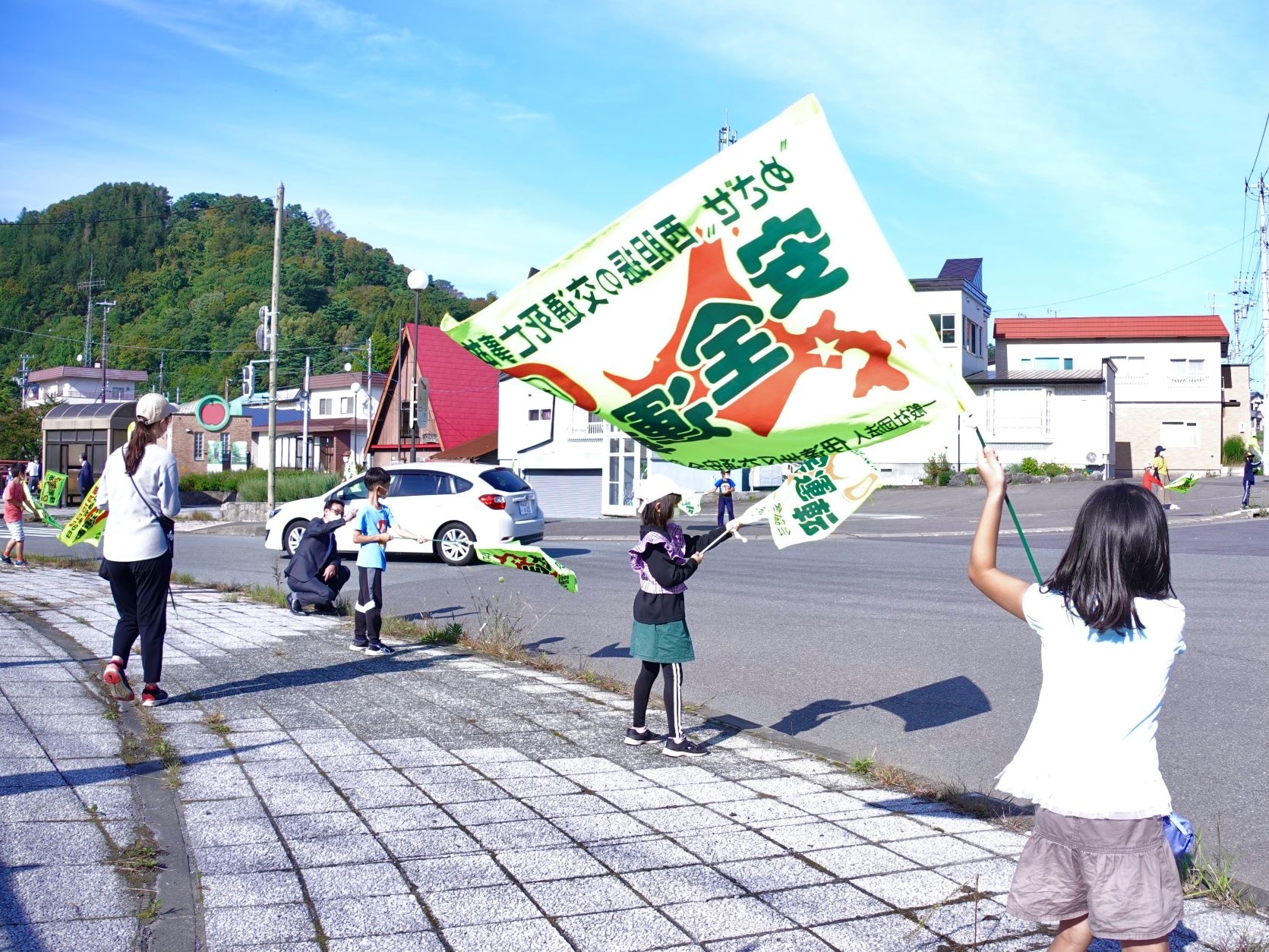 参加した壮瞥小学校2年生の児童は、"安全運転"と描かれた大きな旗を元気よく振っていました。その姿を見て、通過するドライバーはみんな笑顔!手を振っている方も多くいらっしゃいました。