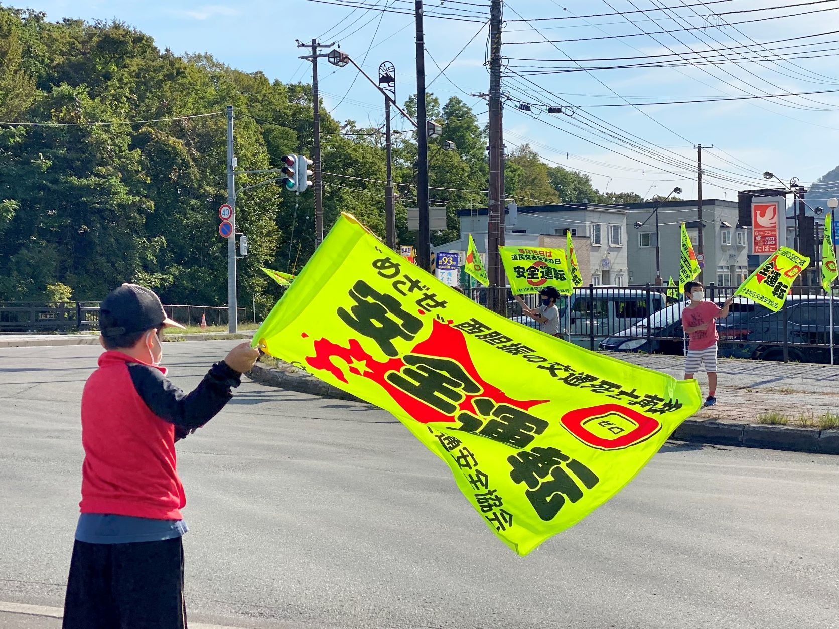 秋の全国交通安全運動に合わせて「旗の波運動」が壮瞥町滝之町(たきのまち)の国道453号と道道2号が交わる三叉路で行われました。![]()