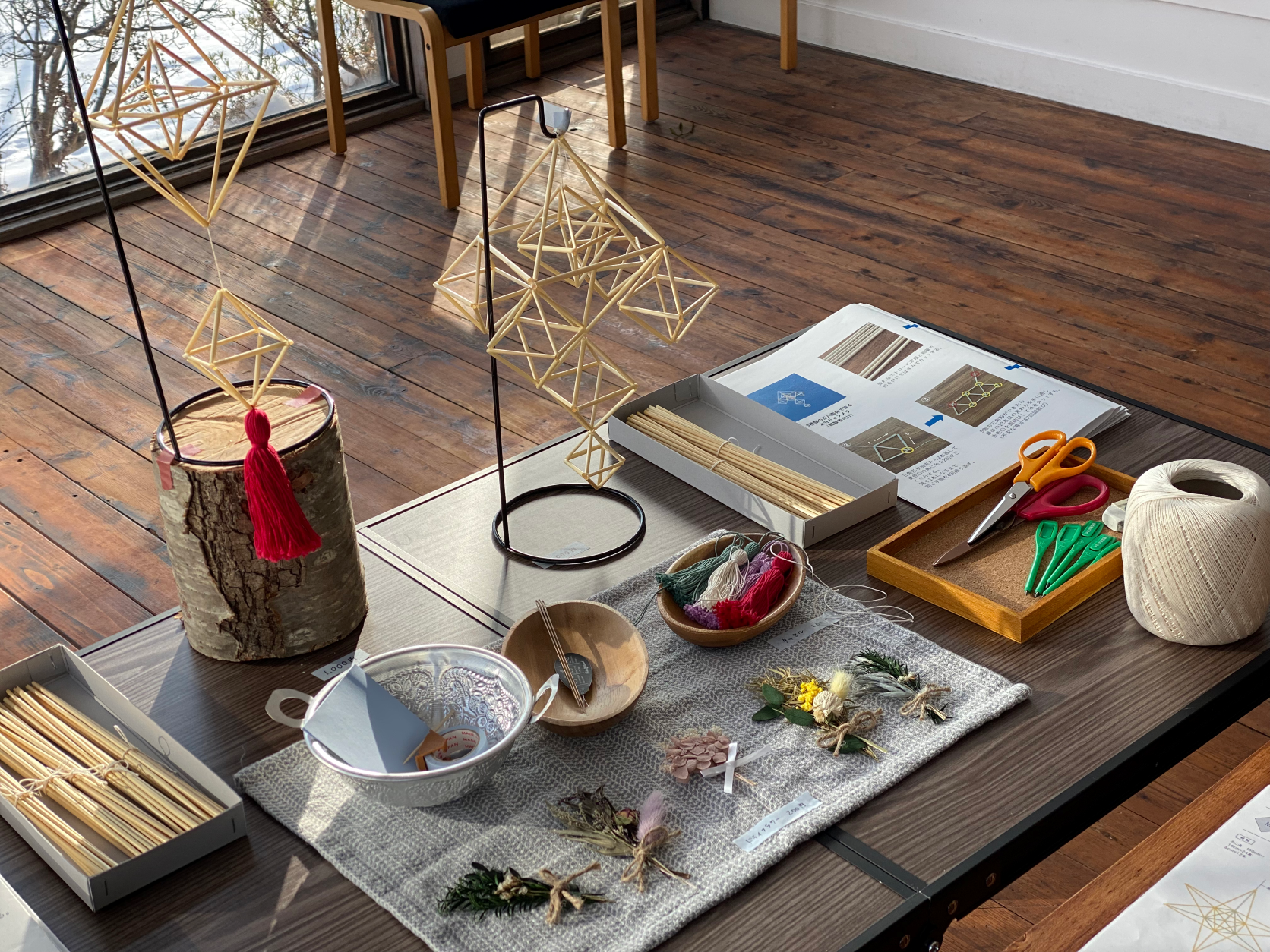 2回目のWS。前回同様に専用のテキストを制作。ヒンメリをテキスト通りに作って終わりではなく、もっと楽しみたい方のために装飾する飾り(タッセルとドライフラワー)を準備してみました。