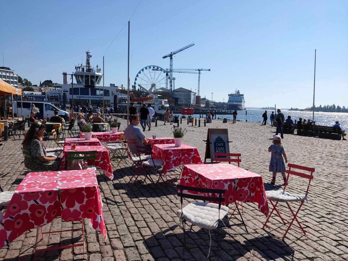 ヘルシンキでグループに分かれて自由行動をしました。各自習った英語などを活用して、港にあるマーケットスクエアまで歩いたり、レストランで食事をしたり、買い物を楽しんだりしていました。天気が心配でしたが、気持ちの良い青空が広がっていました。