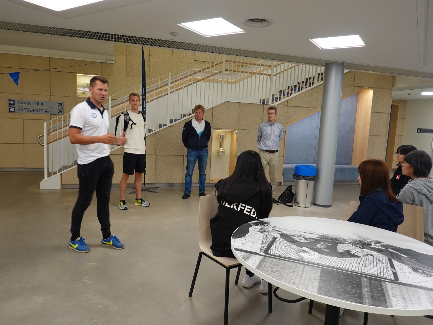 午前中にシベリウスモニュメントを訪問し、次にフィンランドオリンピックセンター(U R H E A)を訪問しました。そこでは、2年前に東京2020オリンピックの事前合宿のために壮瞥町に来町してくれた、アク選手、ヘッドコーチのヤニさん、そしてチームリーダーのトニさんに迎えられ、U R H E Aの中を特別に見学させてもらいました。(こちらについては後日改めて活動レポートにてご報告します)