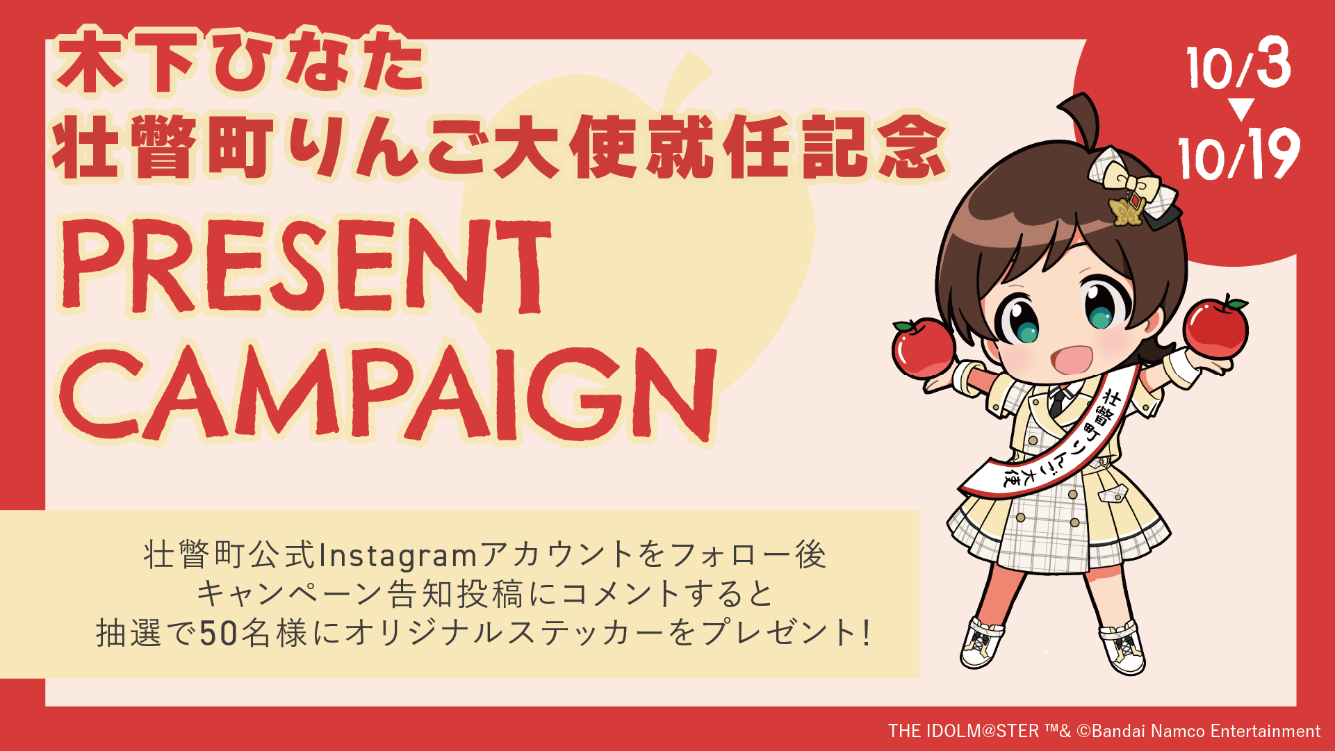 今年開催される第47回りんごまつりは、「そうべつりんごめぐり」と題して、町内の果樹園を巡ってもらうロングラン開催を予定しています。それに伴い、株式会社バンダイナムコエンターテインメントのアイドルプロデュースゲーム「アイドルマスター ミリオンライブ!」より、木下ひなたが壮瞥町りんご大使に就任!