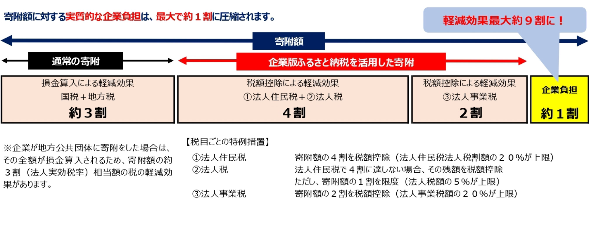 令和2年度の制度改正で税制上の優遇措置が拡充され、損金算入による軽減効果(寄附額の約3割)と合わせて、最大で寄附額の約9割が軽減されるなど、より活用しやすい仕組みとなりました。